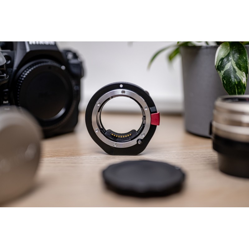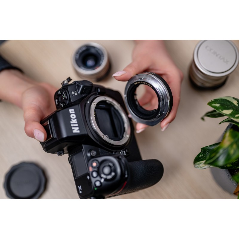 Wspierane tryby autofocusa obejmują AF-S oraz AF-C, w tym funkcje detekcji twarzy, oczu oraz zwierząt, co umożliwia precyzyjne i szybkie ustawienie ostrości na obiektach znajdujących się w kadrze. Adapter pozwala również regulować ostrość manualnie. Cyfrowa komunikacja z aparatem umożliwia też skorzystanie z trybu zdjęć seryjnych, timera i samowyzwalacza.
