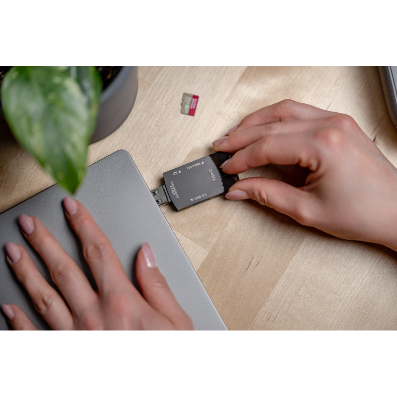 Hub Newell OTG 3 w 1 jest kompatybilny nie tylko z kartami pamięci SD oraz micro SD. Na obudowie urządzenia znajdziesz również gniazdo USB 3.0. Szybko i wygodnie podłączysz do niego pendrive lub dysk zewnętrzny, gdy wszystkie porty w komputerze będą już zajęte.