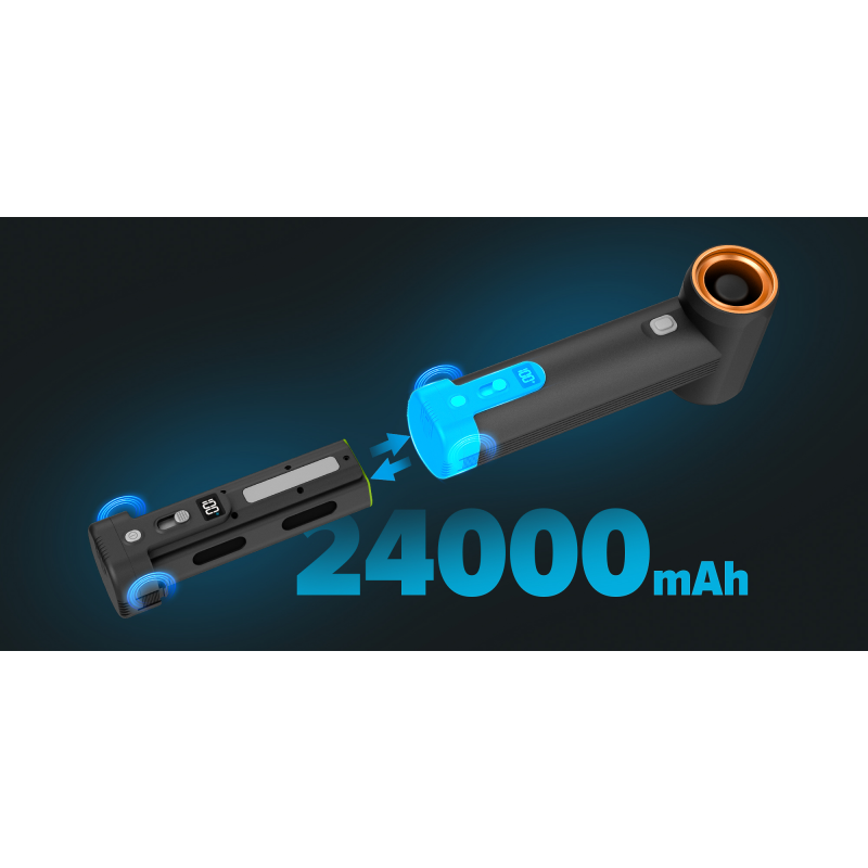 Duża pojemność akumulatora (24000 mAh) zapewni nawet do 5,5 godziny nieprzerwanej pracy na jednym ładowaniu (przy minimalnej sile podmuchu). Jeśli będziesz potrzebować więcej energii, system szybkiej wymiany ogniwa pozwoli zainstalować nowe w ciągu zaledwie 3 sekund. Nie masz pod ręką zapasowego akumulatora? Nic nie szkodzi. Szybkie ładowanie USB-C Power Delivery o mocy 54 W pozwoli uzupełnić energię do pełna w ciągu ok. 2 godzin. Dzięki temu nigdy nie musisz martwić się o brak mocy podczas wykonywania ważnych zadań z dmuchawą FeiyuTech KiCA JetFan Max w dłoni.