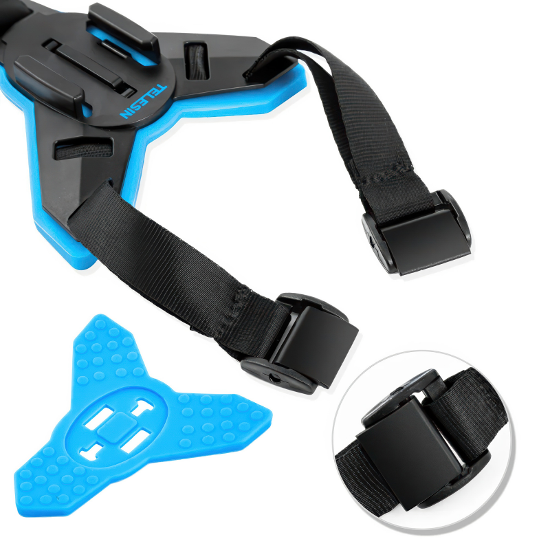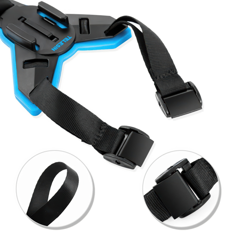 Mocowanie Telesin wyposażono w system szybkiego wypinania bazujący na klamrze typu „J-Hook Buckle”. Takie rozwiązanie ułatwia zarówno zakładanie, jak i zdejmowanie kamery. Cała konstrukcja składa się z lekkich, ale wytrzymałych komponentów z tworzywa PC i silikonu, co zapewnia wysoką odporność na warunki terenowe bez nadmiernego obciążania kasku. Klamra jest kompatybilna z oryginalną bazą GoPro oraz innymi akcesoriami wyposażonymi w mocowanie „J-Hook Buckle” (m.in. mocowania na nadgarstek, górną część kasku lub klatkę piersiową).