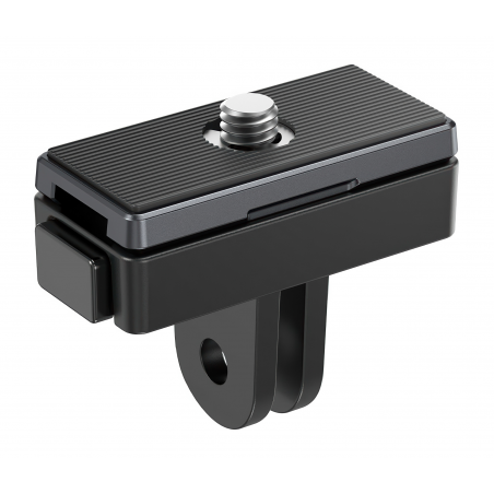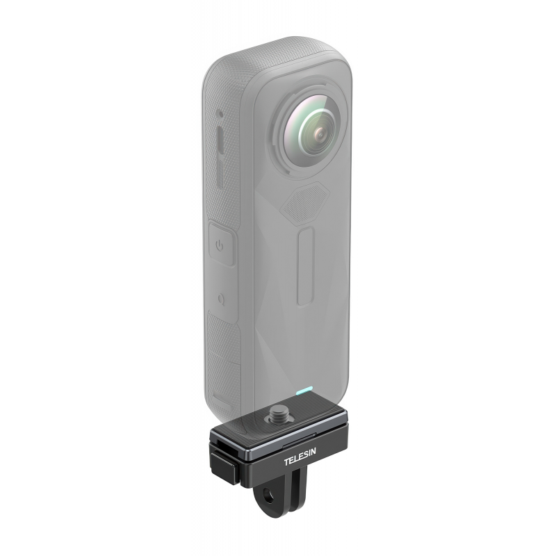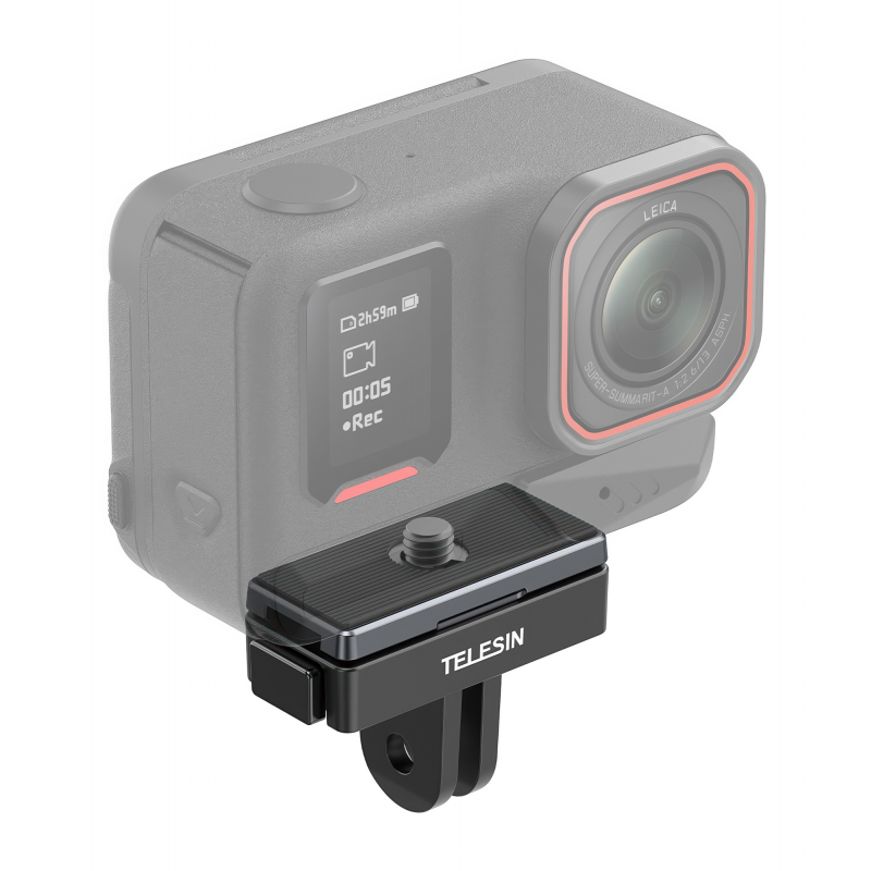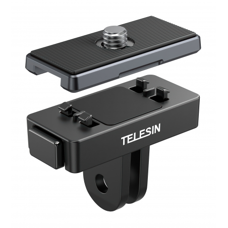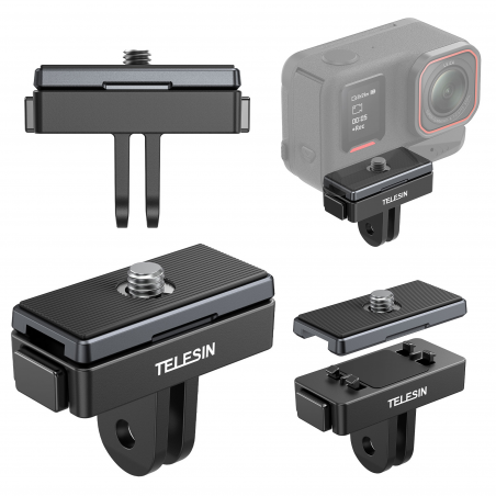 Telesin S7-JBK-18-TIS to magnetyczny adapter szybkiego montażu do kamer Insta360 X3, X4, X5, Ace, Ace Pro i Ace Pro 2. Zestaw składa się z bazy, którą połączysz z mocowaniem GoPro oraz płytki szybkiego montażu, którą wieńczy gwint 1/4". Silny magnes i mechaniczne zatrzaski tworzą razem solidne połączenie odporne na wstrząsy. Aby odpiąć płytkę szybkiego montażu, wystarczy nacisnąć przycisk. W dolnej części bazy znajdziesz standardowe dwuzębne mocowanie GoPro – kompatybilne z setkami uchwytów, ramion i statywów. Całość waży zaledwie 29 g i bez trudu zmieści się w kieszeni kurtki.