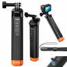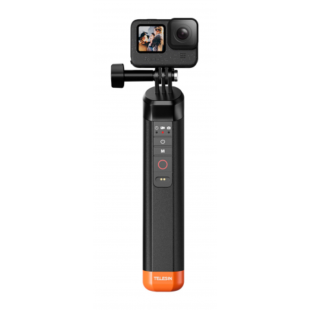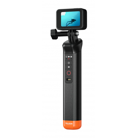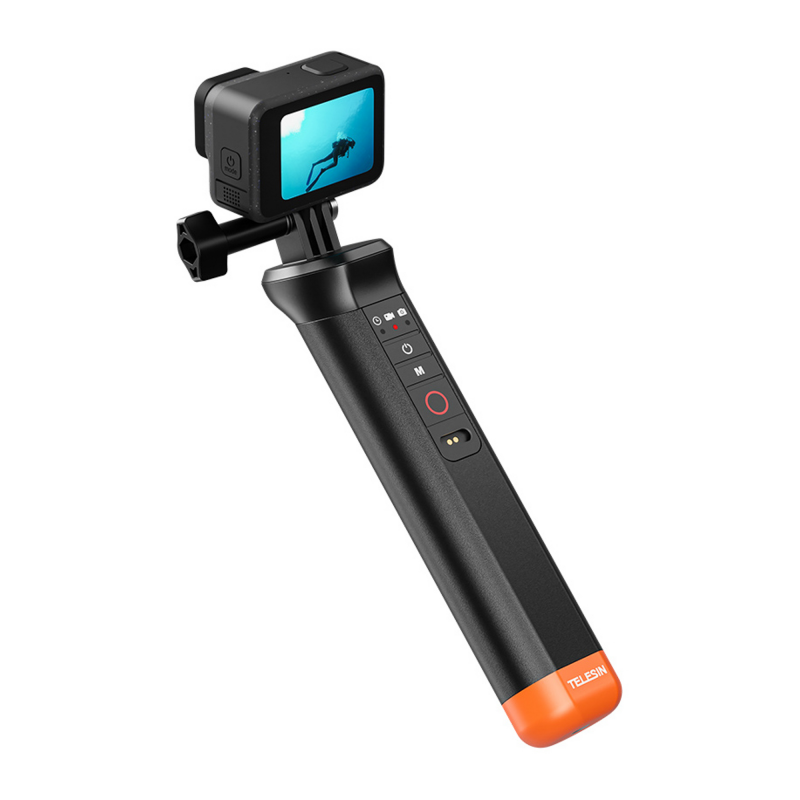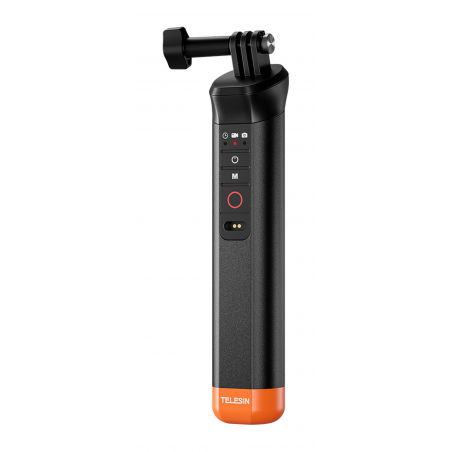 Telesin S4-FHG-01-TGP to wypornościowy uchwyt przeznaczony do kamer sportowych GoPro Hero 8–13. Urządzenie wyposażono we wbudowany pilot Bluetooth, który umożliwia wygodne sterowanie kamerą pod wodą bezpośrednio z poziomu rączki. Jaskrawopomarańczowe wykończenie sprawia, że uchwyt łatwo dostrzec na powierzchni wody, jeśli przypadkowo wyślizgnie się z dłoni. Pilot pozwala włączać i wyłączać kamerę, przełączać tryby oraz uruchomić nagrywanie bez konieczności dotykania samego urządzenia. Wodoodporność do 15 metrów potwierdza certyfikat IP68. Uchwyt ładowany jest za pomocą magnetycznego kabla USB-A. Całość waży zaledwie 84 g.