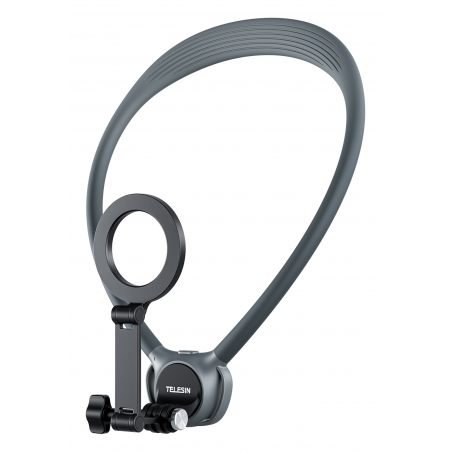 Telesin P2-HNB-02-GY to giętka opaska na szyję do kamer sportowych (mocowanie GoPro), aparatów kompaktowych (gwint 1/4") i smartfonów (pierścień magnetyczny). Od strony klatki piersiowej umieszczono tu miękką poduszkę powietrzną znacząco poprawiającą komfort noszenia. Rdzeń całej konstrukcji to stalowa rurka umożliwiająca zachowanie ustalonego kształtu. Dołączony do zestawu pasek piersiowy pozwala dodatkowo poprawić stabilność konstrukcji w przypadku bardziej dynamicznych aktywności. Wbudowany mechanizm obrotu pozwala przełączać orientację kamery między poziomą a pionową bez dodatkowych adapterów. W zestawie znajdziesz też adapter GoPro na gwint 1/4". Opaska waży 155 g, a jej długość po rozłożeniu to aż 60 cm.