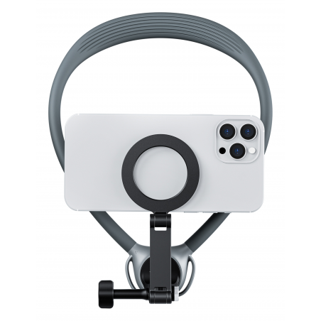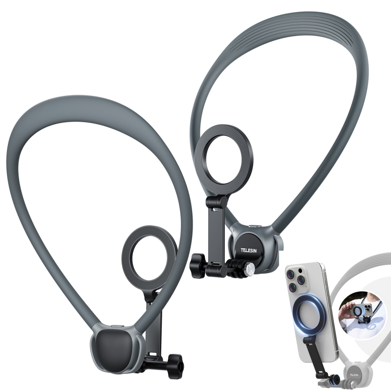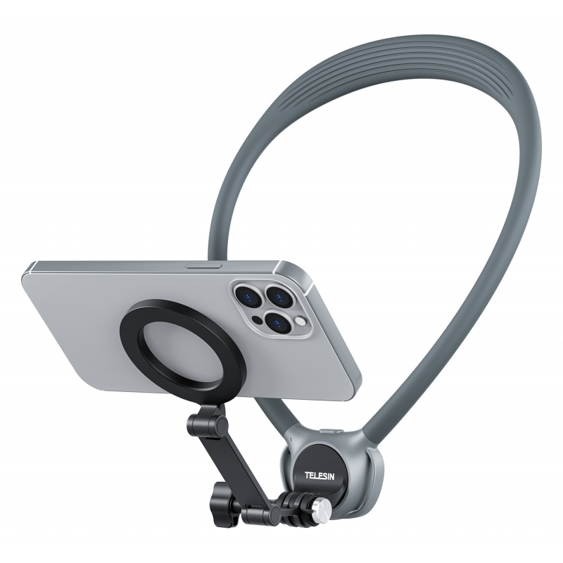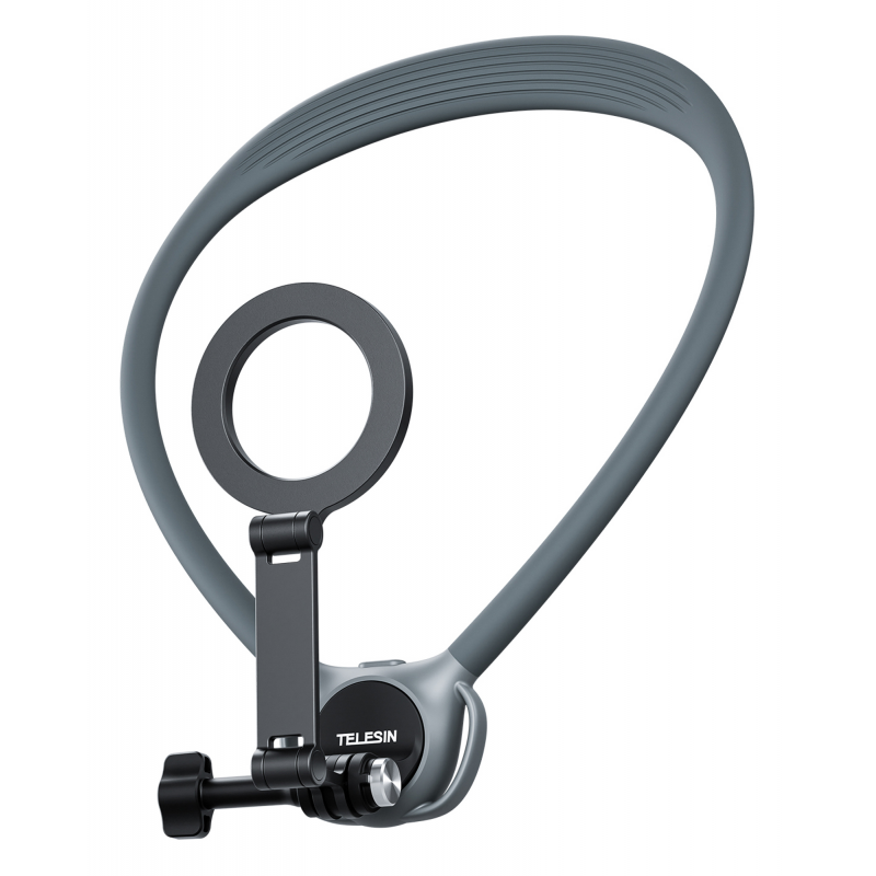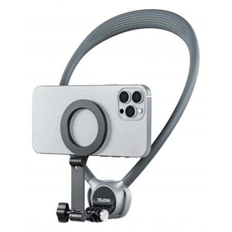 W zestawie z opaską na szyję Telesin P2-HNB-02-GY znajdziesz dwuprzegubowy magnetyczny uchwyt na telefon. Jest on zgodny ze smartfonami i obudowami wspieranymi przez technologię MagSafe. W zestawie znajdziesz też samoprzylepny pierścień, który dodatkowo rozszerza kompatybilność zestawu. Wystarczy zbliżyć telefon do pierścienia magnetycznego, a ten w ciągu jednej chwili połączy się z mocowaniem. Gdy chcesz odebrać połączenie lub sprawdzić nagrane materiały, wystarczy sekunda, żeby wypiąć smartfon. To wygodne rozwiązanie dla twórców, którzy nie ograniczają się jedynie do kamer sportowych i często nagrywają również telefonem.