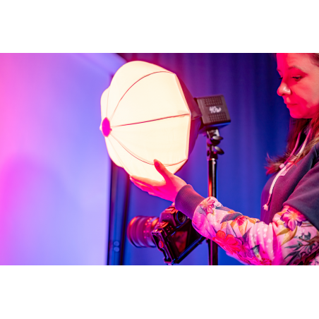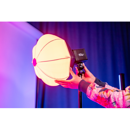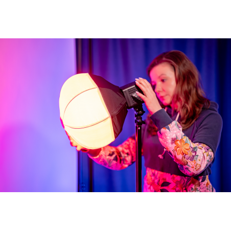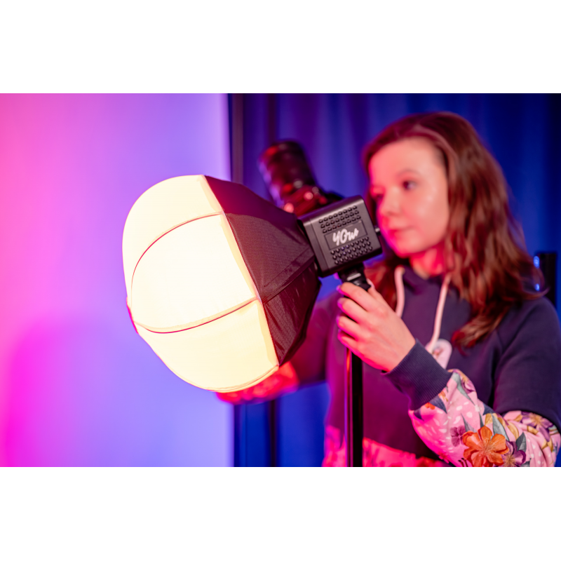 Softbox lantern Newell 30 cm Mini Bowens został zaprojektowany z myślą o idealnej współpracy z lampą Newell Tara 40 RGB. To kompaktowe źródło światła LED łączące moc 40 W z kompaktowymi wymiarami i szerokimi możliwościami kreatywnej pracy. Lampa oferuje regulację temperatury barwowej (2500–6500 K), paletę kolorów RGB oraz 20 efektów specjalnych. W połączeniu z miękkim rozproszeniem, które zapewnia sferyczny softbox, zyskujesz wyjątkowo wszechstronne narzędzie do pracy ze światłem. Wbudowany akumulator 3400 mAh i zasilanie przez USB-C zapewniają pełną mobilność, a wysoki współczynnik CRI ≥95 gwarantuje wierne odwzorowanie kolorów. Połączenie kompaktowej lampy i softboxa typu lampion tworzy wszechstronny zestaw do profesjonalnej pracy ze światłem.