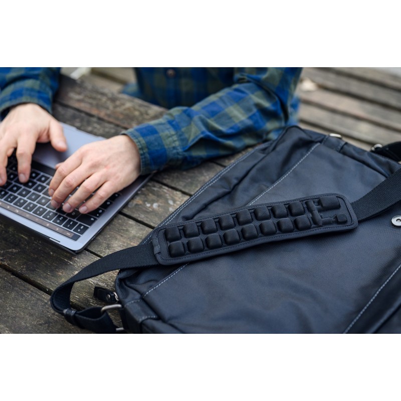 Niezależnie od tego, jaka torba, worek lub sakwa towarzyszy Ci na co dzień, rzepy Velcro pozwolą dopasować podkładkę Humanas Air Cushion R2 do różnych typów pasków. Z powodzeniem wykorzystasz ją z pokrowcami na instrumenty muzyczne, sprzęt foto/video lub inne specjalistyczne akcesoria. Jej właściwości docenią również osoby, które codziennie podróżują do pracy z torbą na laptopa lub skrzynką narzędziową. Humanas Air Cushion R2 to ulga dla Twoich ramion i dodatkowa ochrona pasków, w które wyposażono Twoje bagaże. A ponieważ złożona poduszka powietrzna bez trudu zmieści się w każdym plecaku, będziesz zawsze gotowy(-a) na niespodziewaną długą podróż z torbą na ramieniu, która mogłaby narazić Cię na dyskomfort!