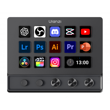 Ulanzi Creative Deck D200X to zaawansowane centrum sterowania stworzone z myślą o twórcach, montażystach, streamerach, fotografach i graczach, którzy chcą pracować szybciej, wygodniej i bardziej intuicyjnie. Urządzenie łączy funkcje programowalnej multimedialnej konsoli z rozbudowaną stacją dokującą 8 w 1. Do dyspozycji masz 14 konfigurowalnych klawiszy z ekranami LCD, 3 precyzyjne pokrętła obsługujące obrót i kliknięcie oraz 2 dodatkowe przyciski. Zestaw w pełni programowalnych narzędzi pozwala błyskawicznie sterować m.in. aplikacjami, skrótami, makrami, transmisją, montażem i oświetleniem. Port HDMI, czytniki kart SD i TF, złącza USB oraz szybkie ładowanie PD 100 W pomagają uporządkować stanowisko pracy i ograniczyć liczbę dodatkowych akcesoriów.