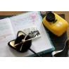 Aparat fotograficzny z drukarką dla dzieci Redleaf BOB położony na blacie biurka z zeszytem w linię