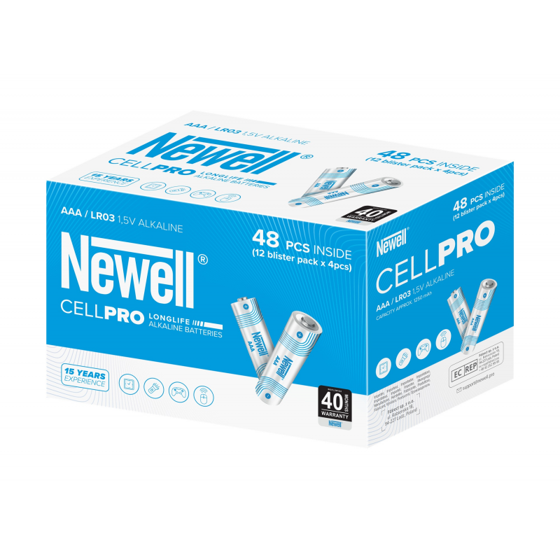Newell CellPro AAA to niezawodne baterie alkaliczne znane również jako LR03 lub po prostu "małe paluszki". Dzięki dużej pojemności i napięciu 1,5 V sprawdzą się w pilotach, zabawkach, padach, latarkach czy myszkach – wszędzie tam, gdzie liczy się stabilne i długotrwałe zasilanie. Baterie są wolne od rtęci, odporne na wycieki i bezpieczne dla urządzeń. Pudełko zawiera 48 ogniw – 12 praktycznych blistrów po 4 sztuki w każdym. Baterie mają aż 10 lat okresu przydatności (od daty produkcji).