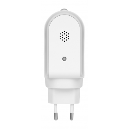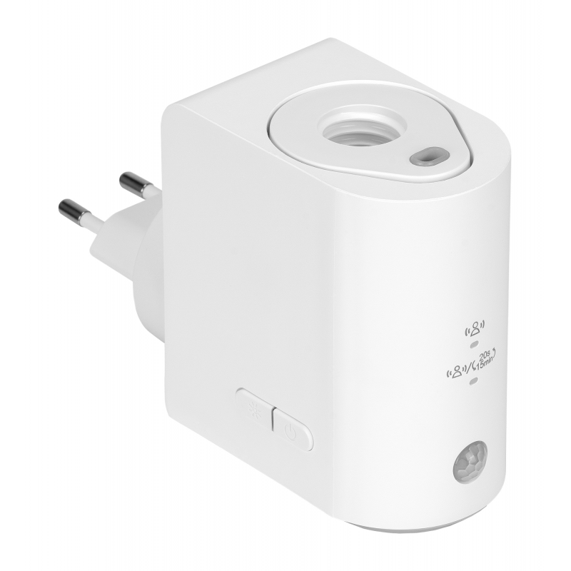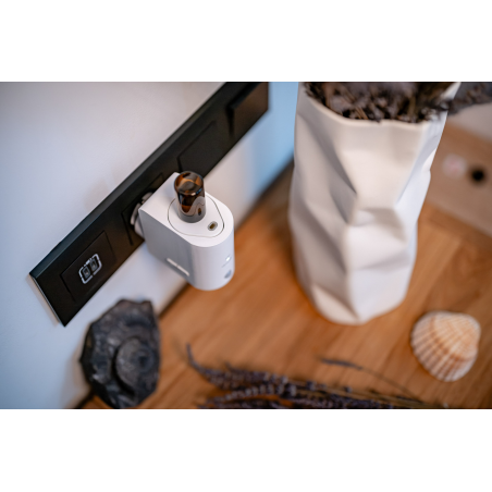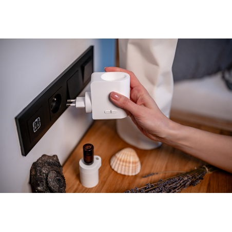 Nie wszystkie gniazdka są ustawione w ten sam sposób – jedne montuje się pionowo, inne poziomo. Właśnie dlatego aromatyzer zapachowy z czujnikiem ruchu Humanas Home Spirit wyposażono w obrotową wtyczkę, która pozwala ustawić urządzenie zawsze w dobrej pozycji, z buteleczką skierowaną w dół. Dzięki temu dyfuzja przebiega prawidłowo. To prosty, ale niezwykle praktyczny element konstrukcji, który ułatwia montaż niemal w każdym pomieszczeniu.