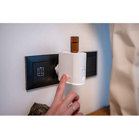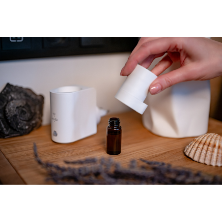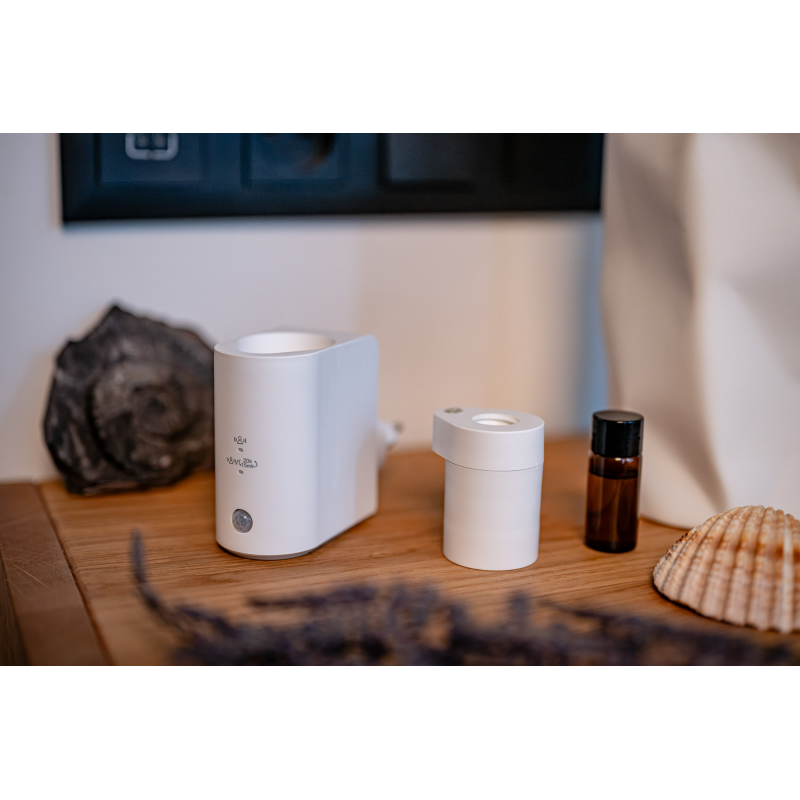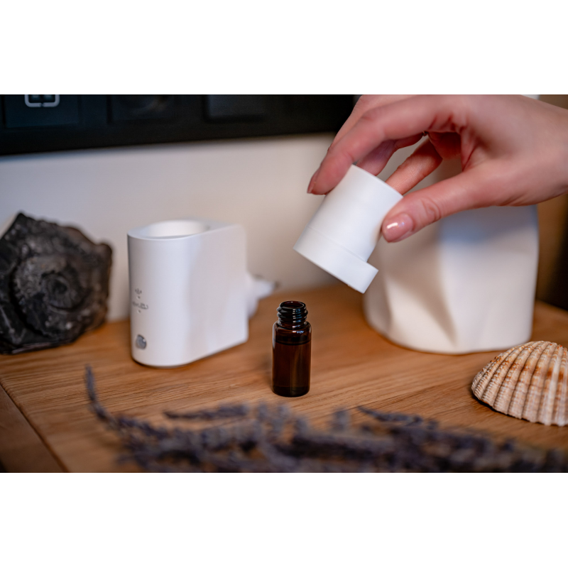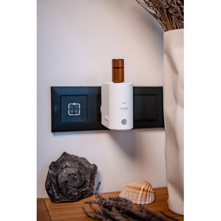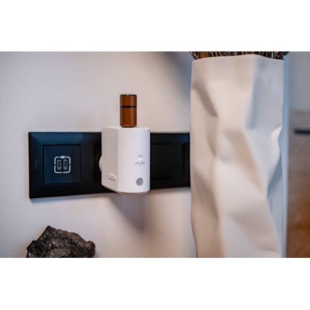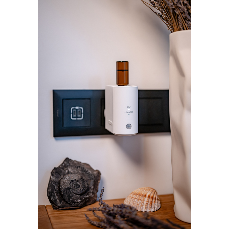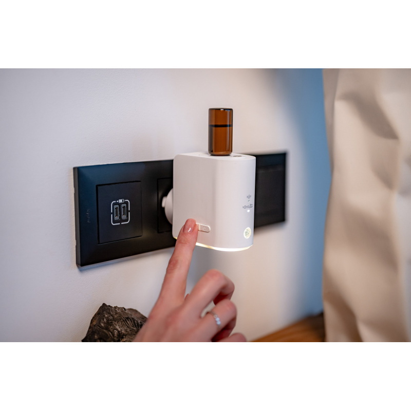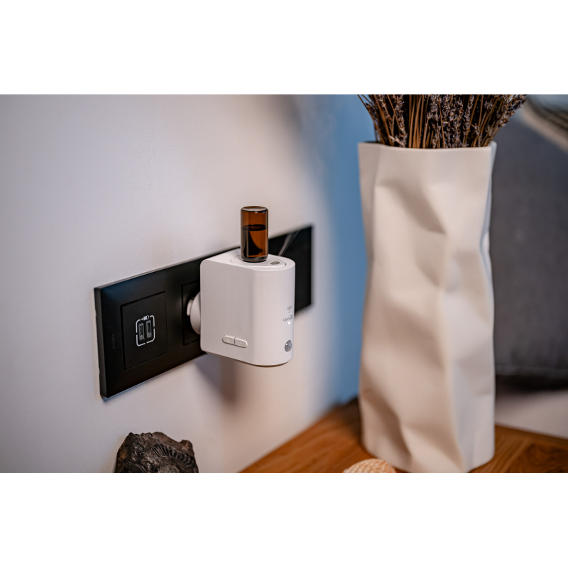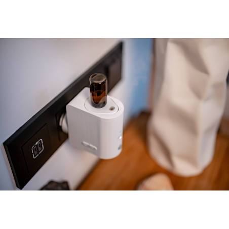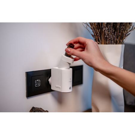 Aromatyzer zapachowy z czujnikiem ruchu Humanas Home Spirit nie korzysta z wody ani dodatkowych zbiorników. Wystarczy wkręcić do niego wybraną buteleczkę z olejkiem eterycznym. Dzięki temu rozwiązaniu urządzenie rozpyla wyłącznie czysty, nierozcieńczony aromat, który pozostaje intensywny i skoncentrowany. Nie trzeba niczego przelewać ani montować dodatkowych pojemników – wymiana zapachu zajmuje dosłownie kilka sekund.