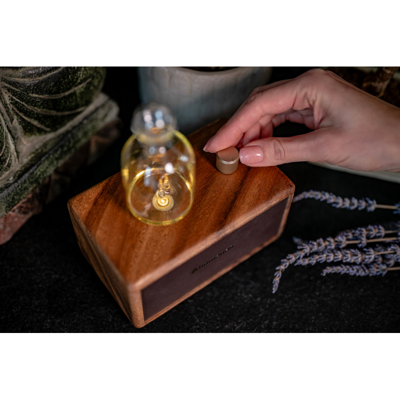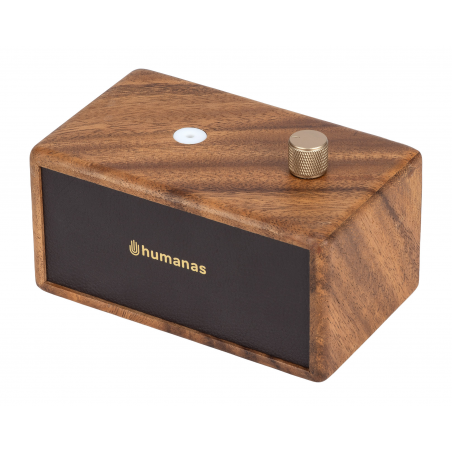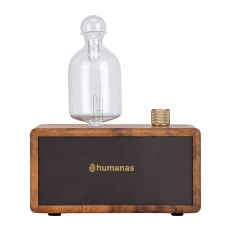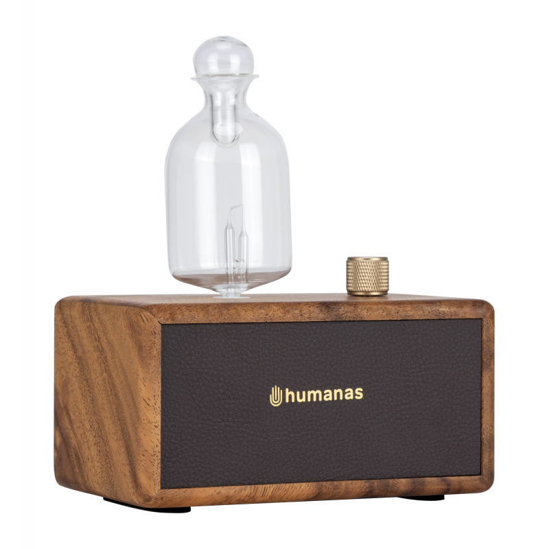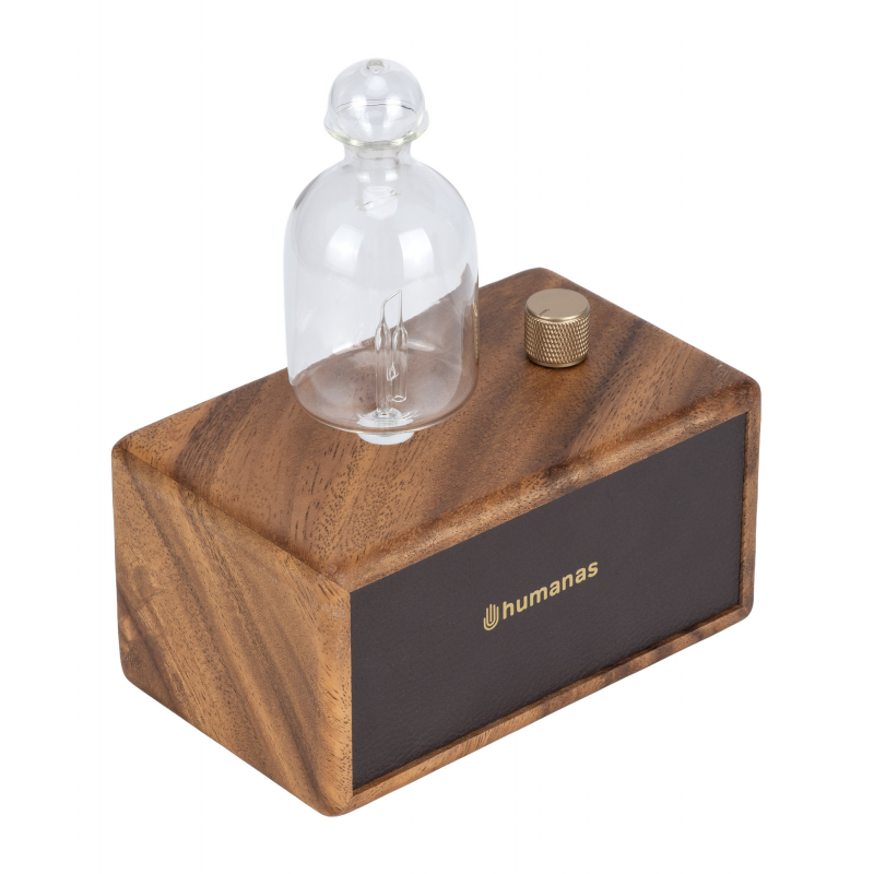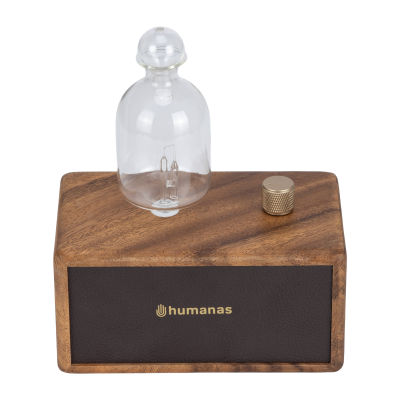 Aromatyzer Humanas Natural Wood przyciąga wzrok elegancką formą oraz szlachetnością użytych materiałów – szkła, drewna oraz syntetycznej skóry. Jego ciepła barwa, delikatne podświetlenie zbiornika, satynowy połysk i przyjemna w dotyku faktura sprawiają, że przypomina bardziej ekskluzywny sprzęt audio, a nie nowoczesny dyfuzor olejków eterycznych. To dekoracyjny akcent, który dodaje pomieszczeniom elegancji, klasy i charakteru premium.