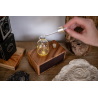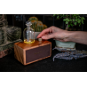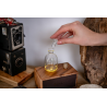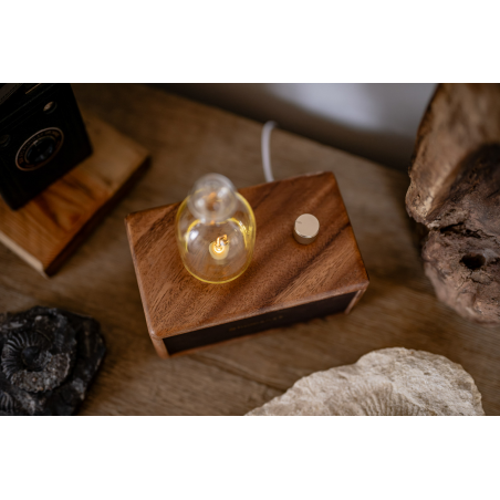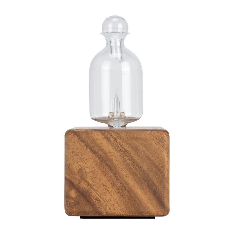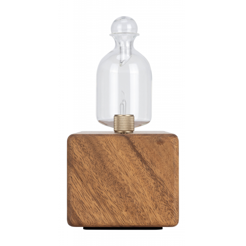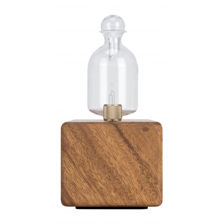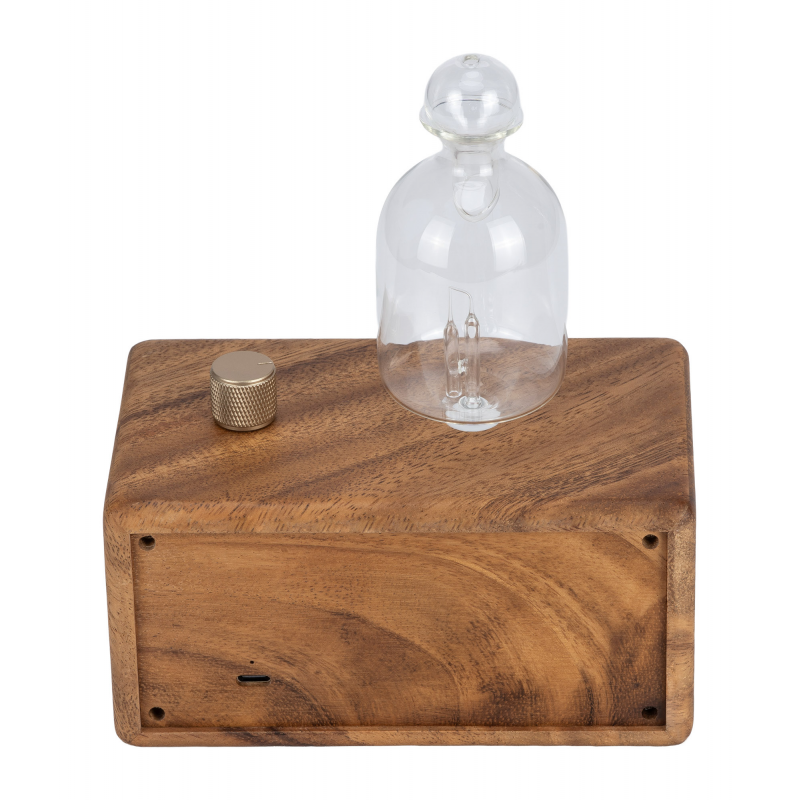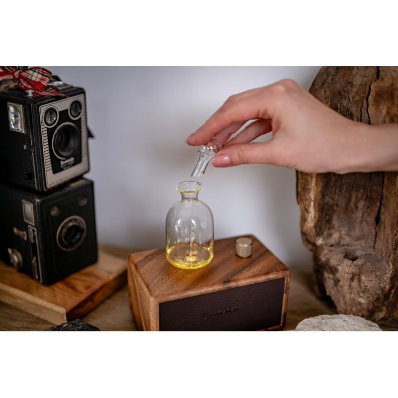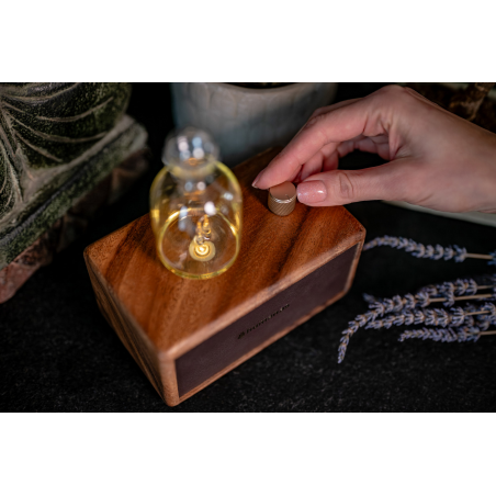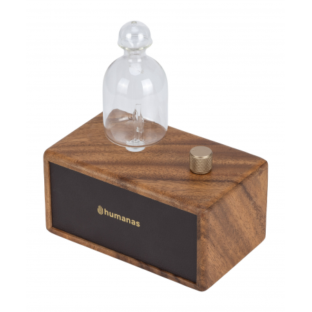 Szklany zbiornik wieńczący drewnianą obudowę aromatyzera zapachowego Humanas Natural Wood zapewnia wyjątkowe wrażenia wizualne. W trakcie pracy urządzenia delikatne ciepłe światło przenika przez jego strukturę, podkreślając naturalne przebarwienia szkła i subtelne skraplanie się olejku na jego ściankach. Komora reaguje również na cykl pracy urządzenia: podczas aktywnej dyfuzji świeci równomiernie, a w czasie przerwy światło zaczyna powoli pulsować, stopniowo rozświetlając się i gasnąc. Dzięki temu aromatyzer jest nie tylko źródłem pięknego zapachu, ale także subtelną ozdobą pomieszczenia.
