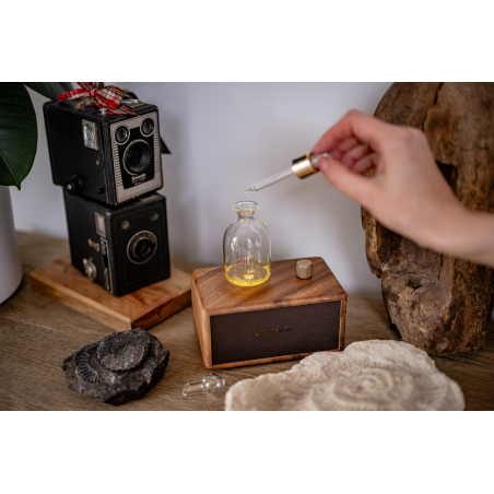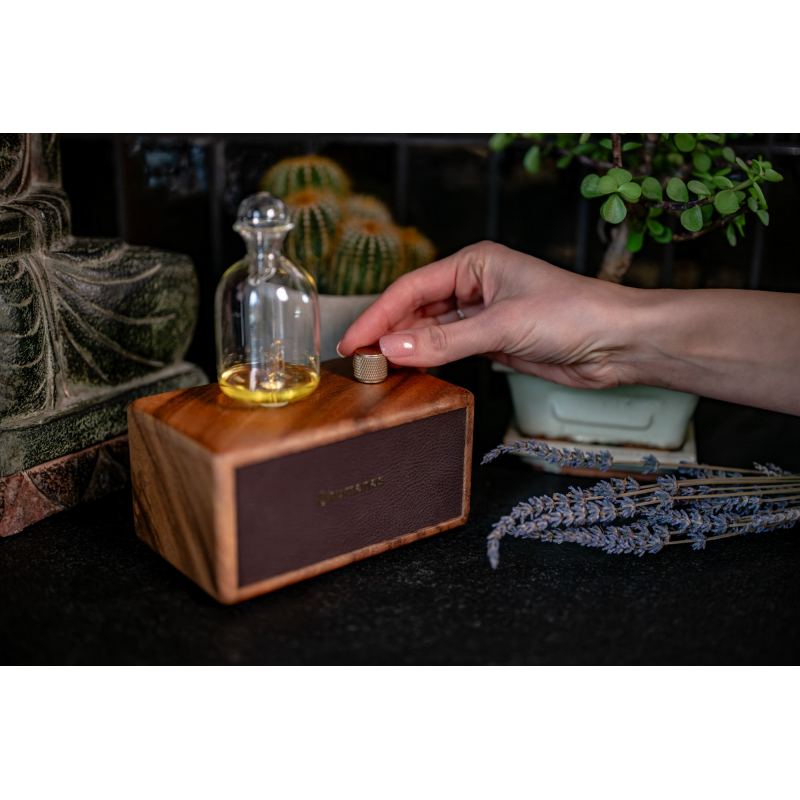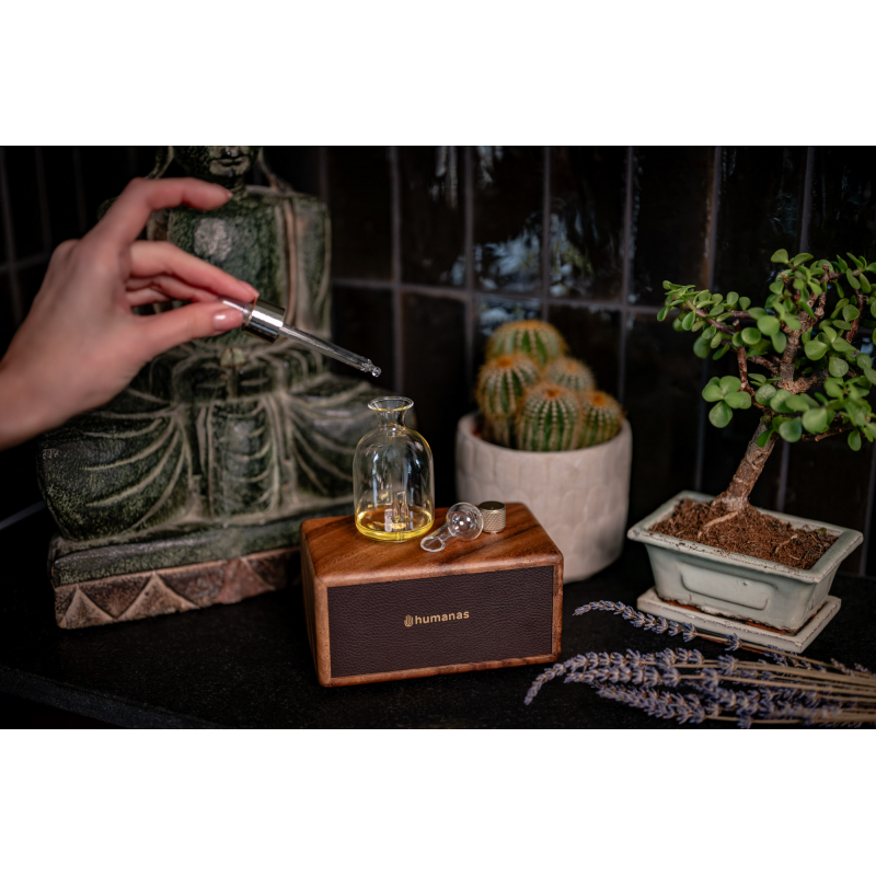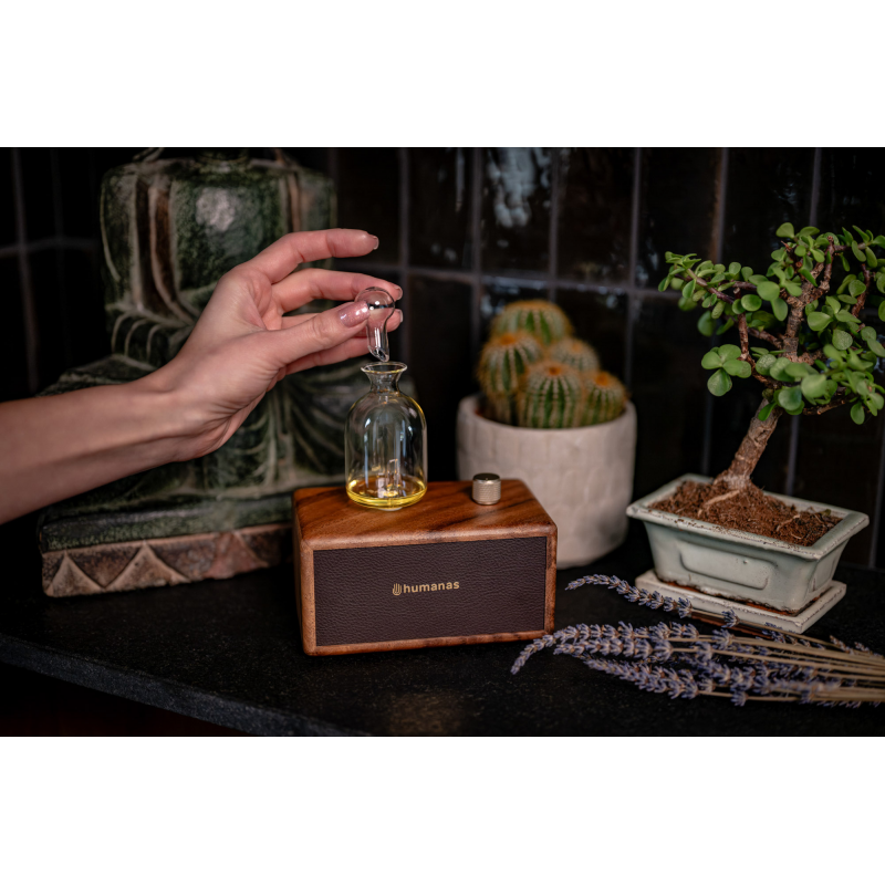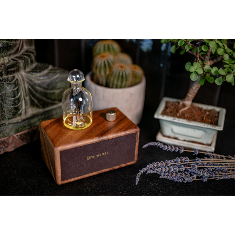 Humanas Natural Wood to aromatyzer zapachowy klasy premium, który łączy kunszt tradycyjnego rzemiosła z nowoczesną technologią aromaterapii. Urządzenie zachwyca połączeniem naturalnego drewna orzechowego, szkła oraz syntetycznej skóry – materiałów, które doskonale wpisują się w stylowe aranżacje wnętrz – od salonu, przez sypialnię, po gabinet czy biuro. Dzięki nowoczesnemu systemowi podgrzewania niewidoczna mgiełka szybko wypełnia przestrzeń czystym, nierozcieńczonym aromatem wybranego olejku. Aromatyzer zapachowy Humanas Natural Wood pracuje w równomiernych cyklach, dbając o równowagę między intensywnością zapachu a komfortem codziennego użytkowania. To idealny wybór dla osób, które cenią autentyczne materiały, dopracowane detale i domową atmosferę relaksu na najwyższym poziomie.