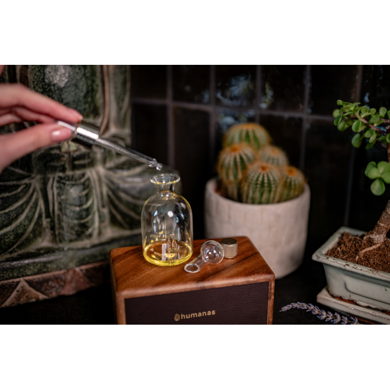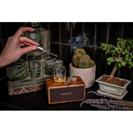 Humanas Natural Wood nie działa jak klasyczny ultradźwiękowy dyfuzor na wodę. Zapach nie jest tu rozcieńczany – jego źródłem jest wyłącznie czysty olejek eteryczny. Dzięki temu aromat pozostaje intensywny, głęboki i długotrwały, bez efektu rozwodnienia, który często pojawia się w nawilżaczach z funkcją aromatyzera. To rozwiązanie pozwala cieszyć się zarówno jednoskładnikowymi olejkami (np. cytryna, lawenda lub mięta), jak i bardziej złożonymi kompozycjami zapachowymi, w których precyzyjnie zaplanowano rozwój aromatu: od nut głowy, przez nuty serca, aż po bazę. Humanas Natural Wood może więc wypełnić Twój dom starannie dopracowanym, luksusowym zapachem, który utrzymuje się w pomieszczeniach przez wiele godzin.