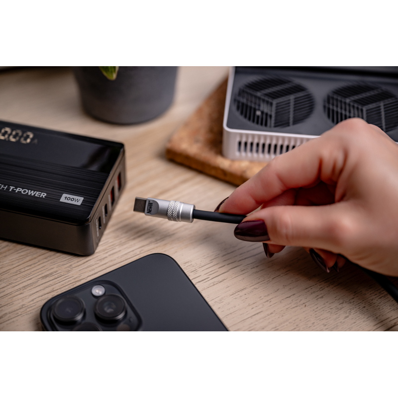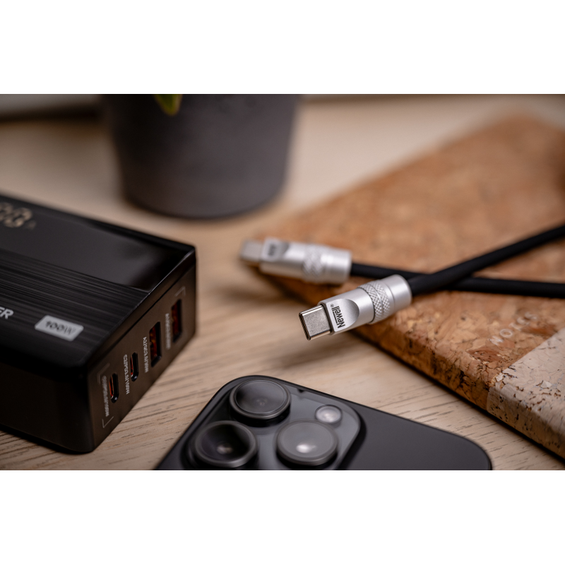 Solidne akcesoria elektroniczne poznaje się po detalach. W tym przypadku warto zwrócić uwagę na aluminiowe końcówki, które nie tylko wyglądają elegancko, ale też znacząco zwiększają odporność na zużycie. Są wytrzymałe, nie wyginają się i bez problemu znoszą intensywne, codzienne użytkowanie. Już po pierwszym kontakcie wiesz, że kabel Newell USB-C – USB-C 100 W zostanie z Tobą na dłużej – solidna konstrukcja, średnica 5,4 mm i silikonowy oplot od razu budzą zaufanie. Każdy element został tu zaprojektowany tak, by przewód służył Ci przez długie lata.