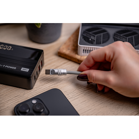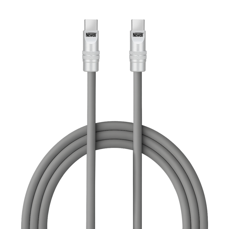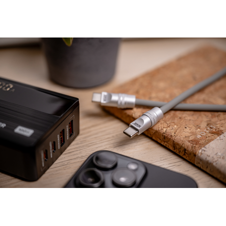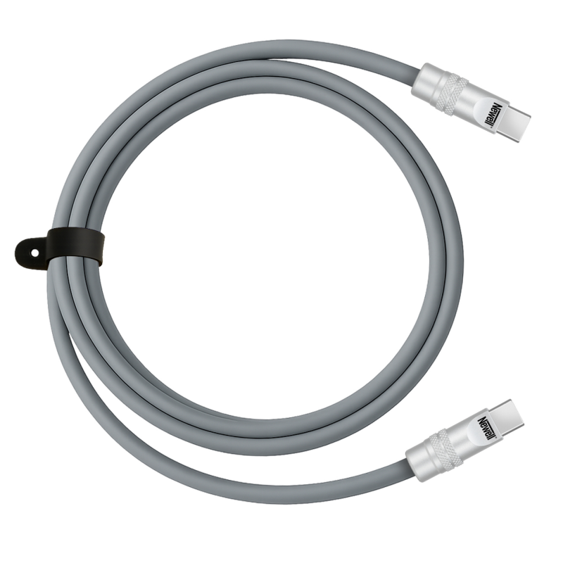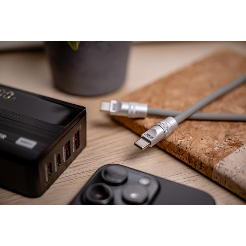 Solidne akcesoria elektroniczne poznaje się po detalach. W tym przypadku warto zwrócić uwagę na aluminiowe końcówki, które nie tylko wyglądają elegancko, ale też znacząco zwiększają odporność na zużycie. Są wytrzymałe, nie wyginają się i bez problemu znoszą intensywne, codzienne użytkowanie. Już po pierwszym kontakcie wiesz, że kabel Newell USB-C – USB-C 100 W zostanie z Tobą na dłużej – solidna konstrukcja, średnica 5,4 mm i silikonowy oplot od razu budzą zaufanie. Każdy element został tu zaprojektowany tak, by przewód służył Ci przez długie lata.
