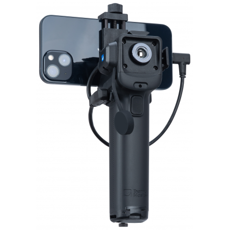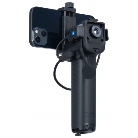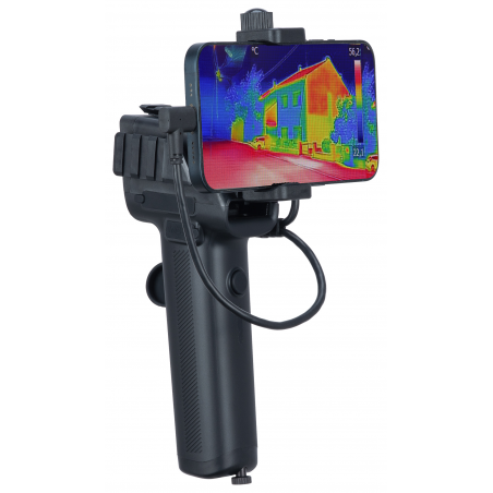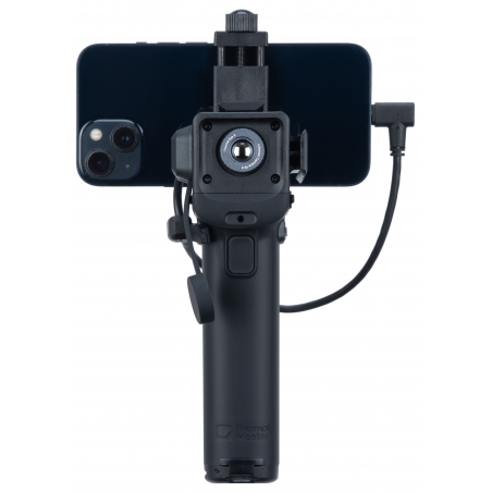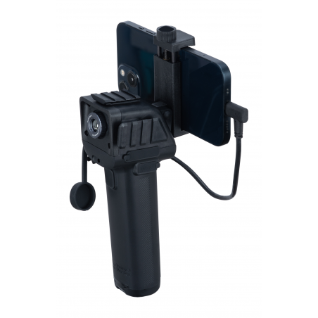 W zestawie z kamerą znajduje się specjalny taktyczny uchwyt ArmorX, który pełni jednocześnie funkcję rączki, stacji dokującej i źródła zasilania. Zaprojektowano ją z myślą o wymagających warunkach terenowych. W jej górnej części umieszczono specjalną obudowę, w której bezpiecznie zadokujesz kamerę Thermal Master X2. Zintegrowany uchwyt na smartfon pozwala stworzyć stabilny, kompaktowy zestaw do obserwacji. Dwie szyny Picatinny umożliwiają montaż akcesoriów – takich jak dalmierz lub latarka. Rączkę wyposażono w 2 przyciski funkcyjne ułatwiające pracę w terenie. Do dyspozycji są też dwa porty USB-C – jeden pozwoli podłączyć się do kamery, drugi posłuży np. do ładowania telefonu. Całość zasilana jest wymiennym akumulatorem 21700 (w zestawie), który zapewnia długi czas pracy i sprawdzi się również jako awaryjne źródło zasilania.