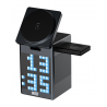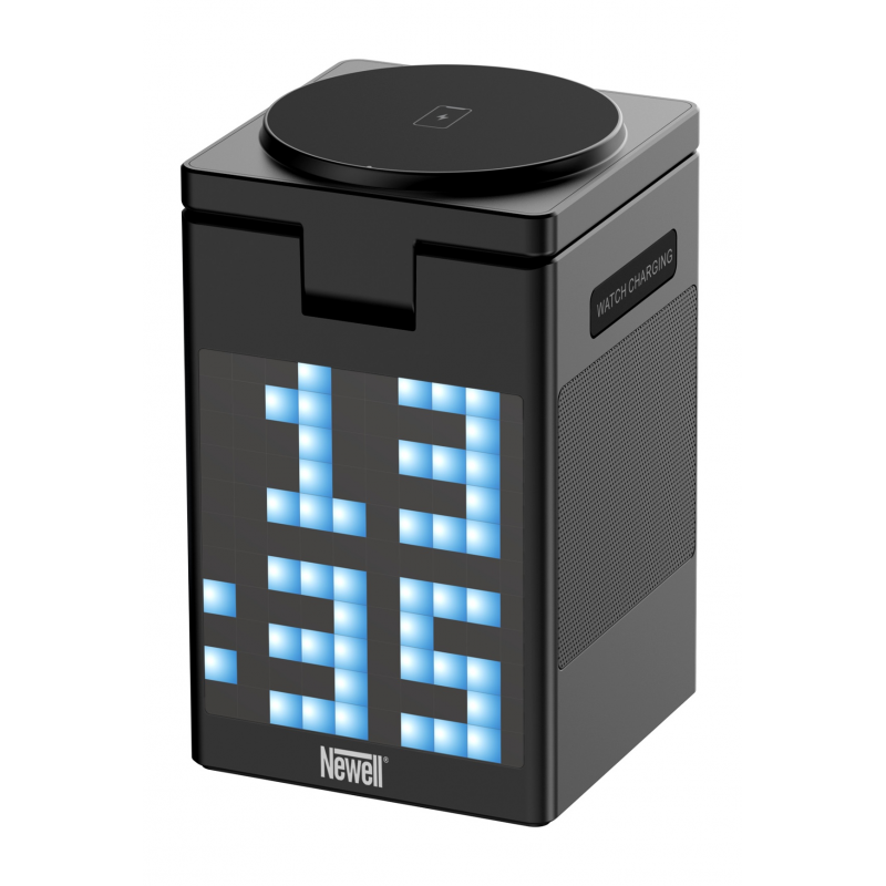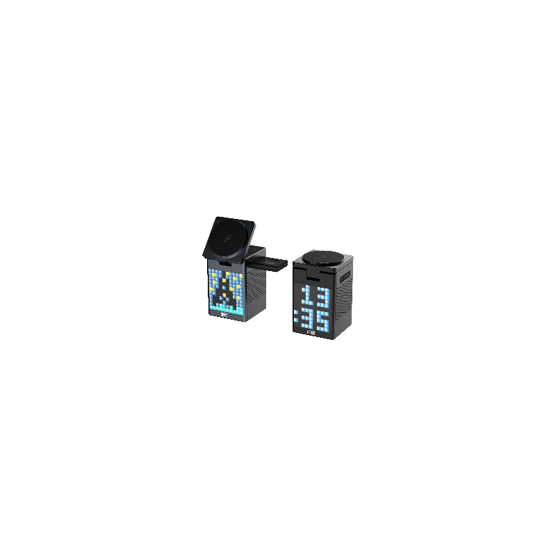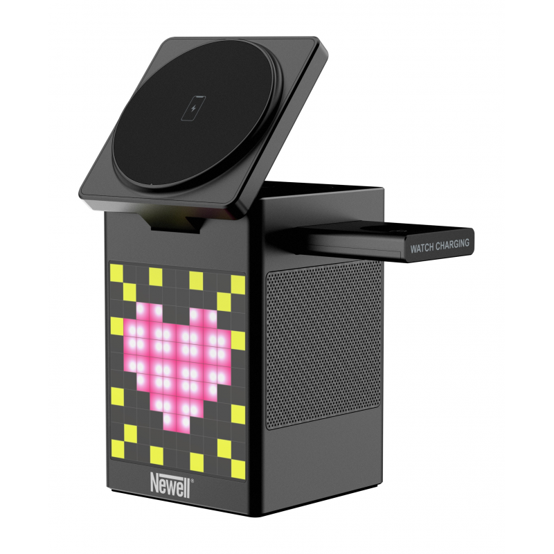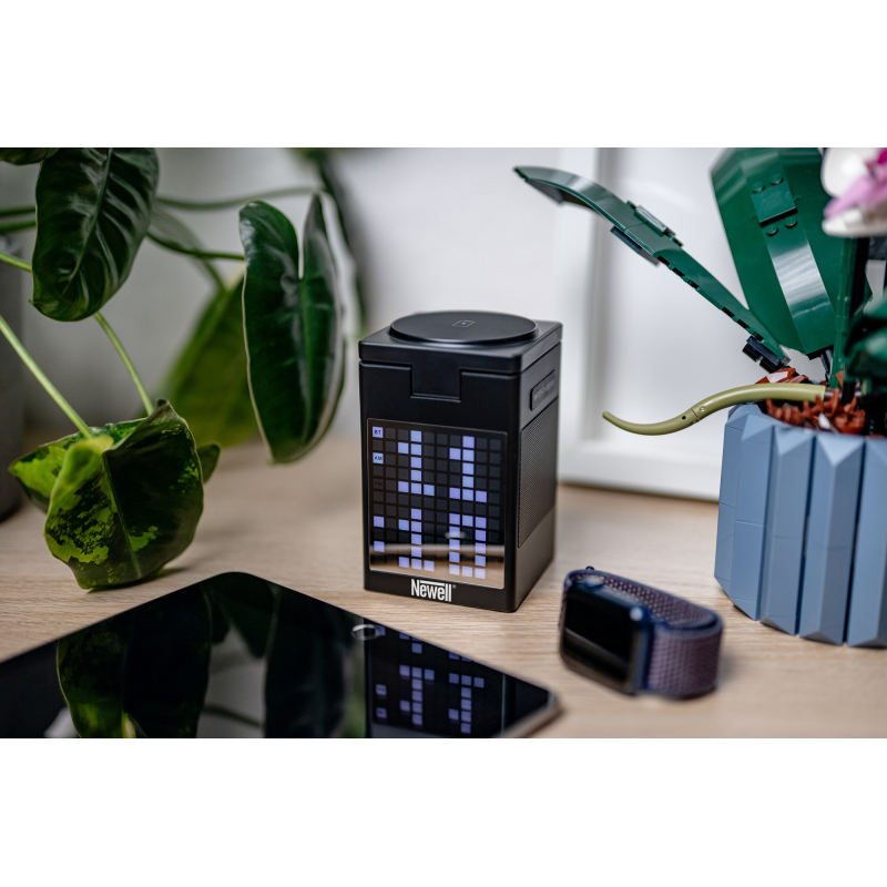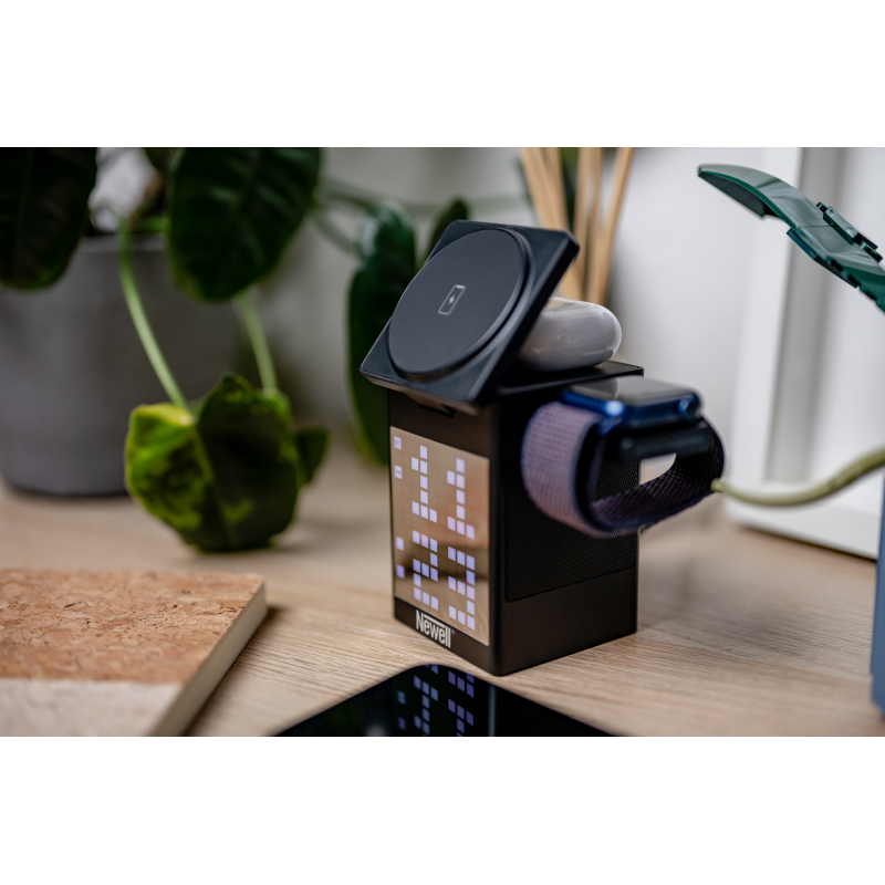 Newell induOne MagPlay to wszechstronna stacja ładowania, która łączy w sobie funkcję bezprzewodowego ładowania 3 różnych urządzeń (smartfon, smartwatch i słuchawki), głośnik Bluetooth i zegar z budzikiem. Magnetyczne mocowanie MagSafe zapewnia stabilność i pozwala ładować telefon w pionie lub poziomie. Wyświetlacz LED z 110 diodami RGB oferuje efektowne animacje "pixel art". Pozwala również wyświetlać godzinę i planować alarmy. Głośnik wspierany przez technologię Bluetooth 5.3 gwarantuje czyste brzmienie stereo i możliwość bezprzewodowej pracy (akumulator 1000 mAh). Specjalna funkcja equalizera pozwala też zwizualizować ulubioną muzykę za pomocą animowanych pikseli. Aluminiowa obudowa podkreśla wysoką jakość wykonania, a samo urządzenie odnajdzie się w każdej nowoczesnej przestrzeni.
