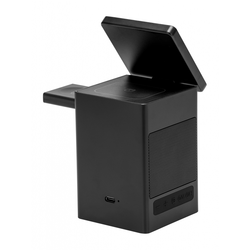 Dzięki wbudowanemu głośnikowi o mocy 5 W wspieranemu przez technologię Bluetooth 5.3 nie potrzebujesz dodatkowych urządzeń, by cieszyć się ulubioną muzyką, podcastami czy audiobookami – w biurze, po pracy lub przed zaśnięciem. Również tutaj nie musisz sięgać po żadne kable. Technologia Bluetooth 5.3 zapewnia stabilne połączenie ze źródłem dźwięku, pełniejsze brzmienie i lepszą odporność na zakłócenia. Wszystko to uzupełnia metalowa siatka umieszczona po obu stronach ładowarki, który chroni jej wnętrze przed kurzem, nie tłumiąc przy tym dźwięku.