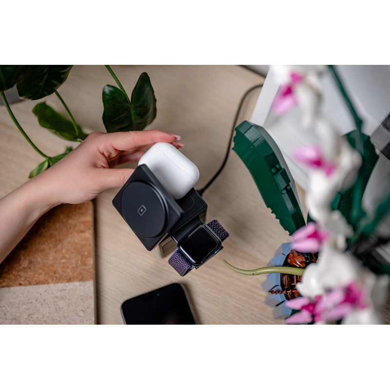 Koniec z plątaniną kabli i szukaniem wolnego gniazdka. Dzięki Newell induOne MagPlay naładujesz jednocześnie aż trzy urządzenia: smartfona (z maksymalną mocą 15 W), słuchawki (5 W) oraz smartwatch (2,5 W). Wszystko odbędzie się w trybie bezprzewodowym, co nie tylko pozwoli Ci zaoszczędzić czas i miejsce, ale też usprawni codzienne korzystanie z ulubionych akcesoriów. Technologia inteligentnego dopasowania prądu czuwa nad bezpieczeństwem ładowania, a silny magnes pozwala pewnie zamocować telefon wspierający standard MagSafe zarówno w pionie, jak i w poziomie.