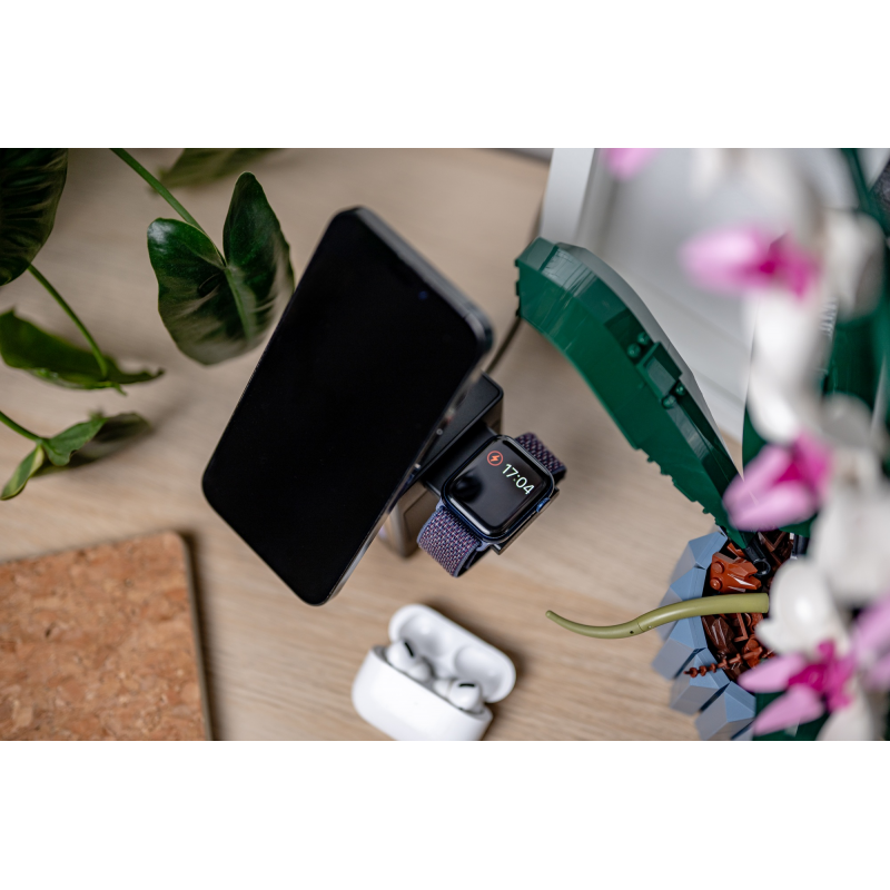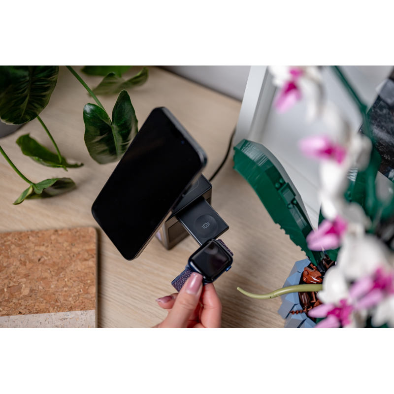 Wysuwany moduł ładowania zegarkaKluczowa cecha stacji ładowania Newell induOne MagPlay to jej wszechstronność. Dzięki składanemu mocowaniu MagSafe możesz dopasować kąt nachylenia telefonu do swoich upodobań – złożone redukuje zajmowaną przestrzeń, a rozłożone zapewnia wygodny podgląd ekranu. To jednak nie wszystko. Wystarczy jedno kliknięcie, by z obudowy dyskretnie wysunąć moduł ładowarki do zegarka. Błyskawicznie zawiesisz na nim swój smartwatch, zyskując pewność, że wkrótce także on będzie gotowy na intensywny dzień.
