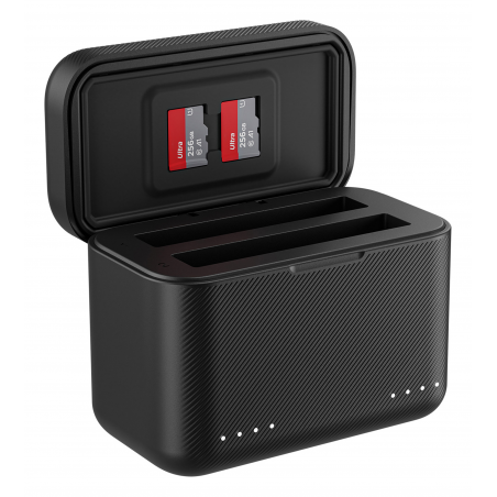 Oprócz funkcji ładowania, ładowarka Telesin SO-BCG-03-TIS do akumulatorów Insta360 X3 pełni również rolę organizera. Wbudowane dwa sloty na karty microSD pozwalają uporządkować drobne, ale kluczowe akcesoria, które często giną w plecaku. Dzięki temu masz zawsze pod ręką zarówno naładowane akumulatory, jak i zapasowe karty pamięci – gotowe na kolejną sesję.