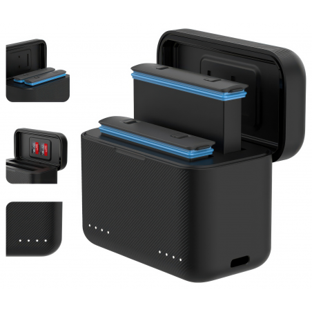 Ładowarka dwukanałowa Telesin SO-BCG-03-TIS do akumulatorów Insta360 X3 wspiera system szybkiego podglądu stanu naładowania akumulatorów. Wystarczy unieść pokrywę, by natychmiast zobaczyć poziom energii dostępnej w obu ogniwach. Do każdego z akumulatorów przypisano 4 diody LED, które informują o naładowaniu (25%, 50%, 75% i 100%). To wygodne i przejrzyste rozwiązanie, które eliminuje domysły. Z tą ładowarką zawsze wiesz, kiedy sprzęt jest gotowy do dalszego działania.