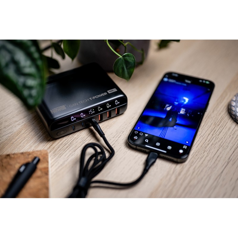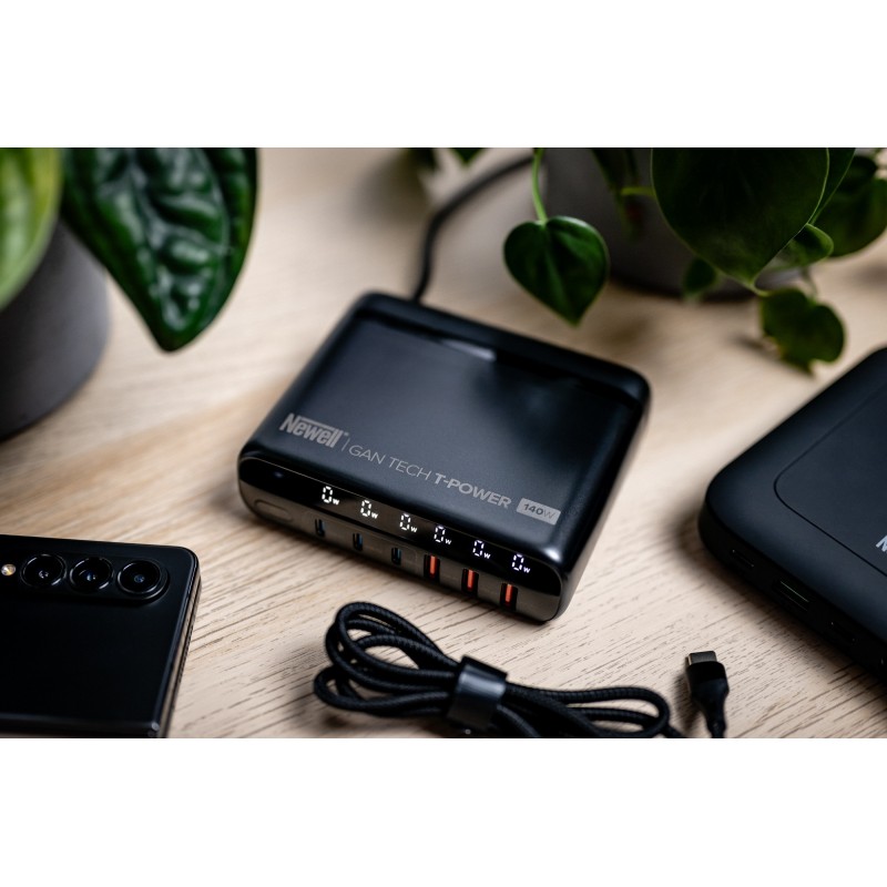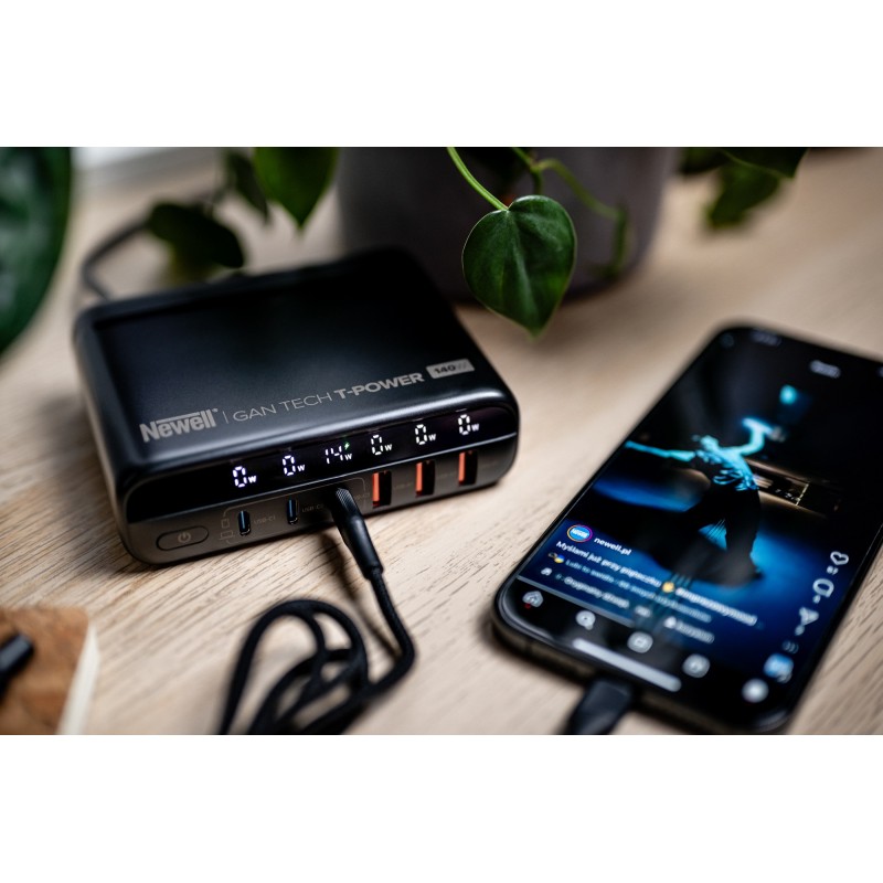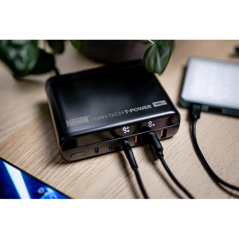 Ładowarka typu GaN to prawdziwa rewolucja w świecie przenośnej elektroniki. Krzemowe komponenty zastąpiono w niej azotkiem galu. Dzięki temu udało się zmniejszyć przestrzeń zajmowaną przez podzespoły i zamknąć je w bardziej kompaktowej obudowie. Innowacyjna technologia sprawia również, że urządzenie jest szybsze i wydajniejsze. Newell GaN Tech T-power 140 W oferuje też znacznie większą moc niż większość tradycyjnych ładowarek dostępnych na rynku.