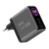 Ładowarka Newell GaN 100 W TFT została wyposażona w duży, wyraźny i podświetlany ekran TFT, który zapewnia kontrolę nad procesem ładowania. Za pomocą jednego przycisku możesz przełączać między różnymi trybami widoku – od podstawowego stanu gotowości, przez aktualny pobór mocy (całkowity lub z podziałem na poszczególne porty), aż po temperaturę pracy i łączny czas użytkowania urządzenia. Przytrzymanie przycisku umożliwia obrócenie wyświetlanych treści o 180 stopni. Dzięki temu dostosujesz orientację ekranu do tego, jak ładowarka została wpięta do gniazdka. To drobny, ale przemyślany detal, który znacząco poprawia komfort użytkowania.