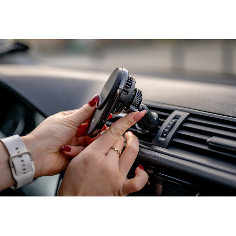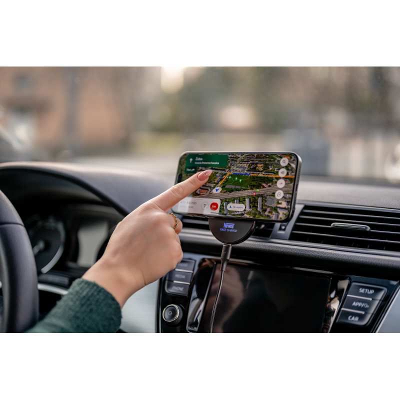 Dzięki doskonale dopasowanym magnesom uchwyt samochodowy Newell z indukcyjną ładowarką MagSafe S18 mocno trzyma się smartfona, umożliwiając efektywne i bezprzewodowe ładowanie z mocą nawet do 15 W (standard Qi). Urządzenie nie tylko utrzymuje stabilną pozycję telefonu podczas jazdy, ale także umożliwia korzystanie z niego w trakcie uzupełniania energii.