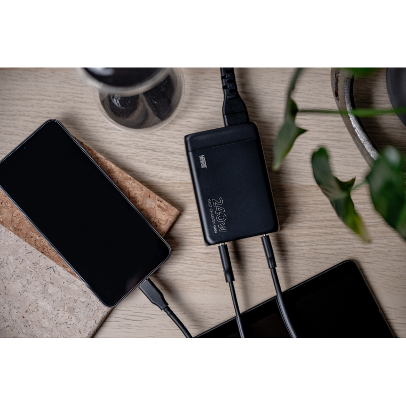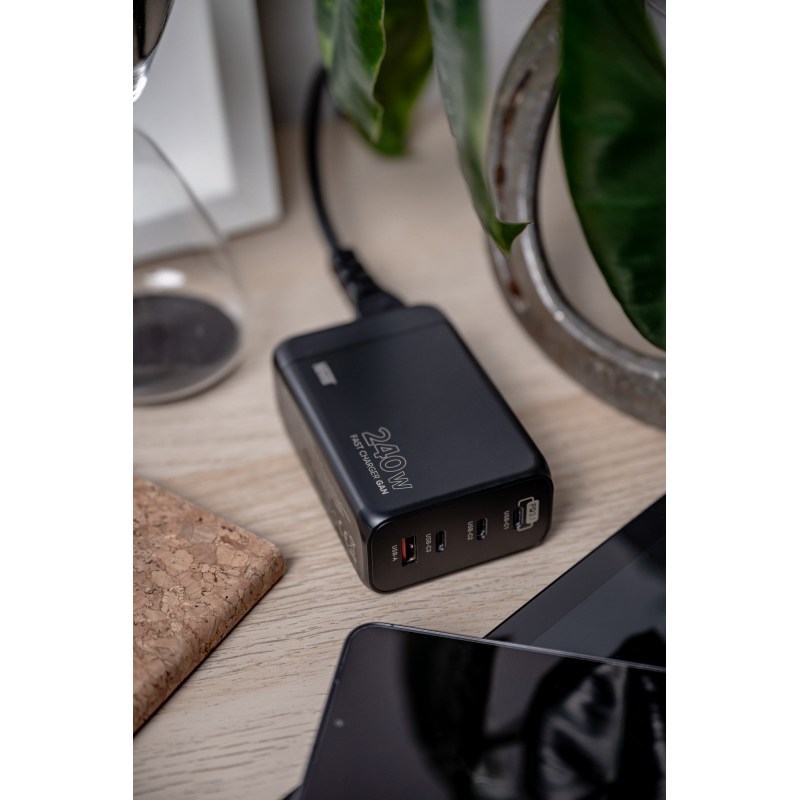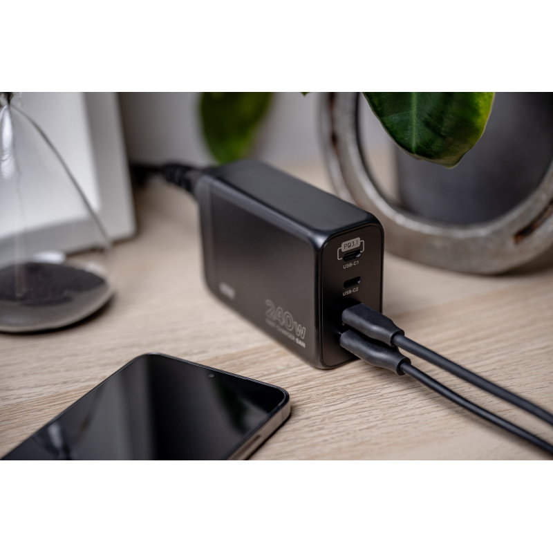 Ładowarka sieciowa Newell GaN 240 W - EU to oszczędność przestrzeni i doskonały wybór dla osób, które często podróżują. Urządzenie zapewnia dostęp do czterech portów ładowania – 3 USB-C oraz z USB-A. Ładowarka GaN pozwoli szybko i wygodnie naładować smartfon, tablet, laptop, smartwatch, czytnik e-booków latarkę lub inne urządzenie zgodne ze standardem USB.