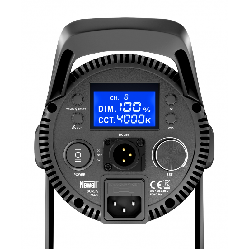 Lampę Newell Surja Max wyposażono w popularne mocowanie Bowens. Zapewnia ono szeroką kompatybilność z różnymi typami modyfikatorów stosowanych w filmie i fotografii. Dzięki mocowaniu połączysz lampę z dołączoną do zestawu czaszą lub z innymi akcesoriami, takimi jak wrota, softboxy lub strumienice.