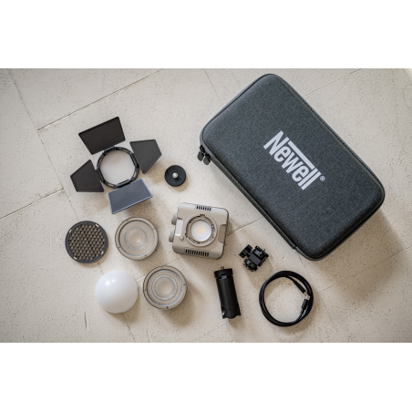 Lampa Newell Zora Mini 40 RGB została wyposażona w mocowanie Mini Bowens, które umożliwia szybką i wygodną wymianę modyfikatorów światła. Wszystkie akcesoria dołączone do zestawu – soczewki, dyfuzor, plaster miodu i wrota – można zamontować w kilka sekund. To rozwiązanie zapewnia stabilne połączenie i wygodę pracy, a jednocześnie otwiera drogę do dalszej rozbudowy zestawu o kolejne akcesoria zgodne z tym standardem.