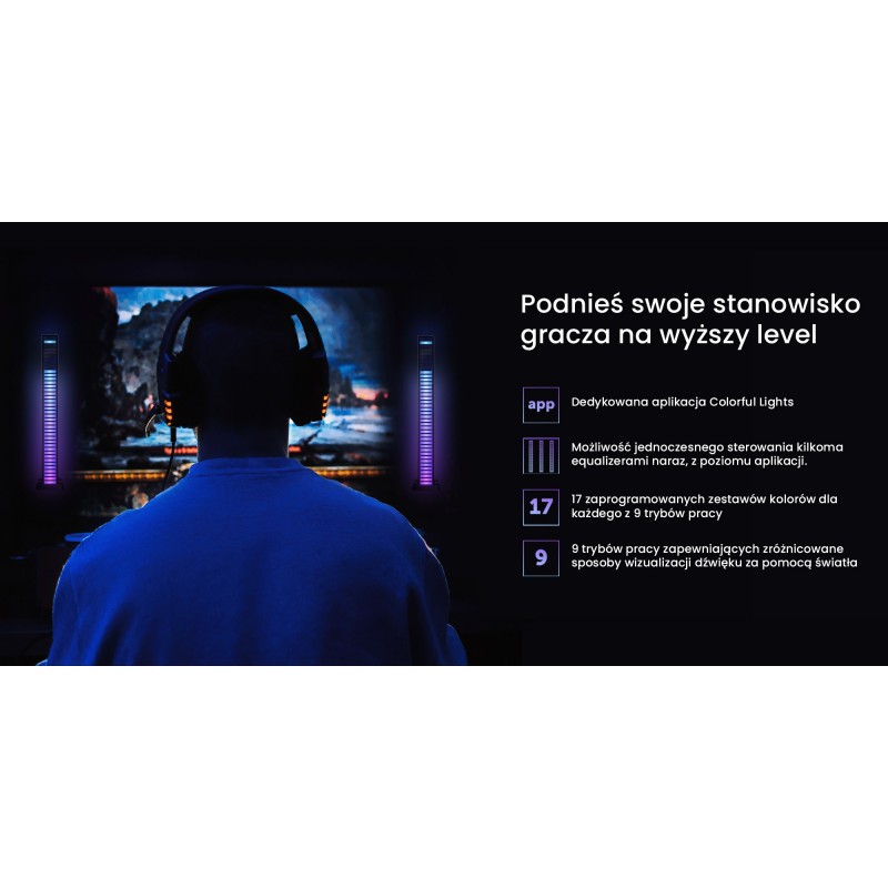 Equalizer RGB Redleaf 40LED to wyjątkowe urządzenie, które pozwoli uzyskać niepowtarzalny klimat za pomocą unikalnej kombinacji kolorowych świateł reagujących na dźwięk w czasie rzeczywistym. Stwórz klubową atmosferę w swoim domu lub przenieś swoje stanowisko gracza na zupełnie nowy poziom. Innowacyjna technologia rozpoznawania dźwięku działa w oparciu o nowoczesny 32-bitowy procesor ARM. To dzięki niemu diody LED będą wyświetlały unikalne kolorowe animacje w rytmie Twoich ulubionych hitów lub zapalą się na czerwono dokładnie wtedy, gdy oddasz strzał z broni w ulubionej grze. Gdy muzyczny panel LED znajdzie się w salonie, sypialni, samochodzie lub studiu nagraniowym z pewnością znajdziesz setki sposobów na to, jak światło może podkreślić charakter miejsca lub towarzyszących Ci dźwięków!