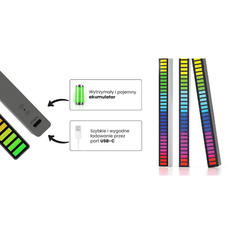 Wybierając equalizer RGB Redleaf 40LED nie musisz martwić się o zapas baterii. Urządzenie szybko naładujesz z poziomu power banku, komputerowego portu USB lub ładowarki. Do zestawu dołączono metrowy przewód USB-A / USB-C, który ułatwi to zadanie. O poziomie naładowania muzycznego panelu poinformują Cię świecące diody LED, których będzie przybywać wraz z uzupełnianą mocą.