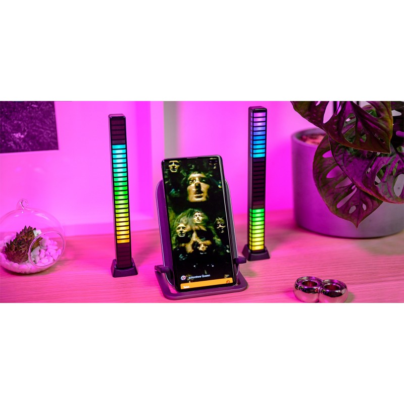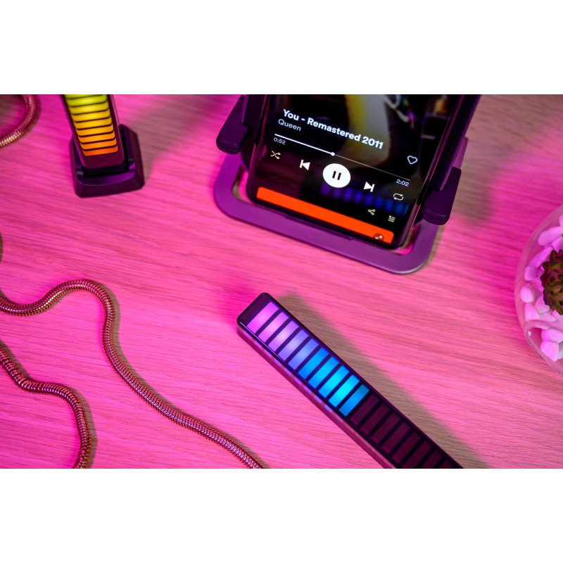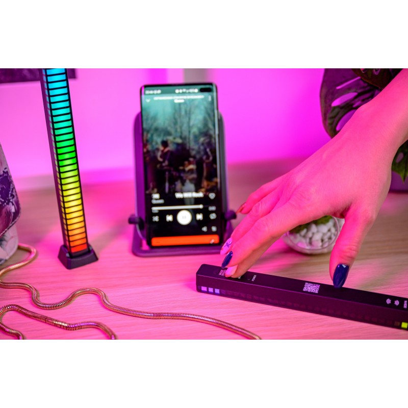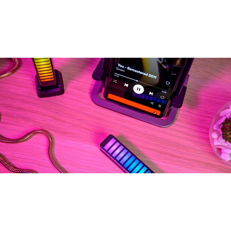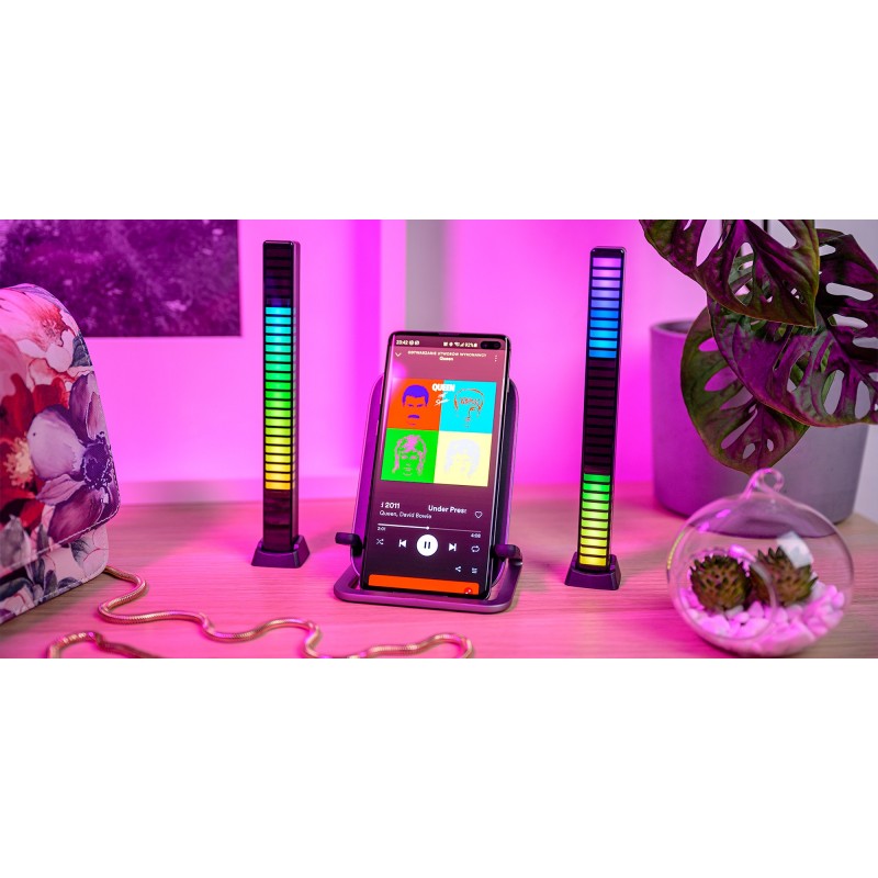 Urządzenie oferuje 9 unikalnych animacji świetlnych, które w różny sposób reagują na dźwięk, poprzez zmieniające się kolory diod LED. Dodatkowo każdy z trybów może działać w oparciu o 17 wariantów kolorystycznych wizualizacji. To aż 153 unikalne kombinacje! Dodając do tego możliwość regulowania poziomu jasności i szybkości wyświetlanych animacji, a także koło kolorów dostępne z poziomu aplikacji otrzymujesz niemal nieograniczoną liczbę opcji personalizacji equalizera pod kątem każdego rodzaju muzyki i dźwięków.