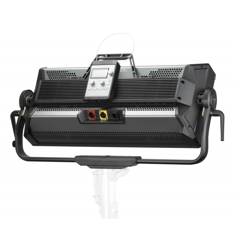 Kolejną innowacją, która poprawia komfort i wygodę pracy ze światłem na planie filmowym jest kontroler wyposażony w ekran OLED i ergonomiczne pokrętła oraz przyciski. W ciągu sekundy wepniesz go w specjalne gniazdo umieszczone na tylnym panelu lampy. Dzięki zastosowaniu 8-pinowego konektora nie musisz podłączać kontrolera za pomocą kabla, zyskując tym samym lepszą ergonomię pracy. Jeśli jednak zdecydujesz się na obsługę lampy z większej odległości, a nie chcesz korzystać z łączności bezprzewodowej, w zestawie z urządzeniem znajdziesz też profesjonalny kabel XLR o długości 3 metrów.