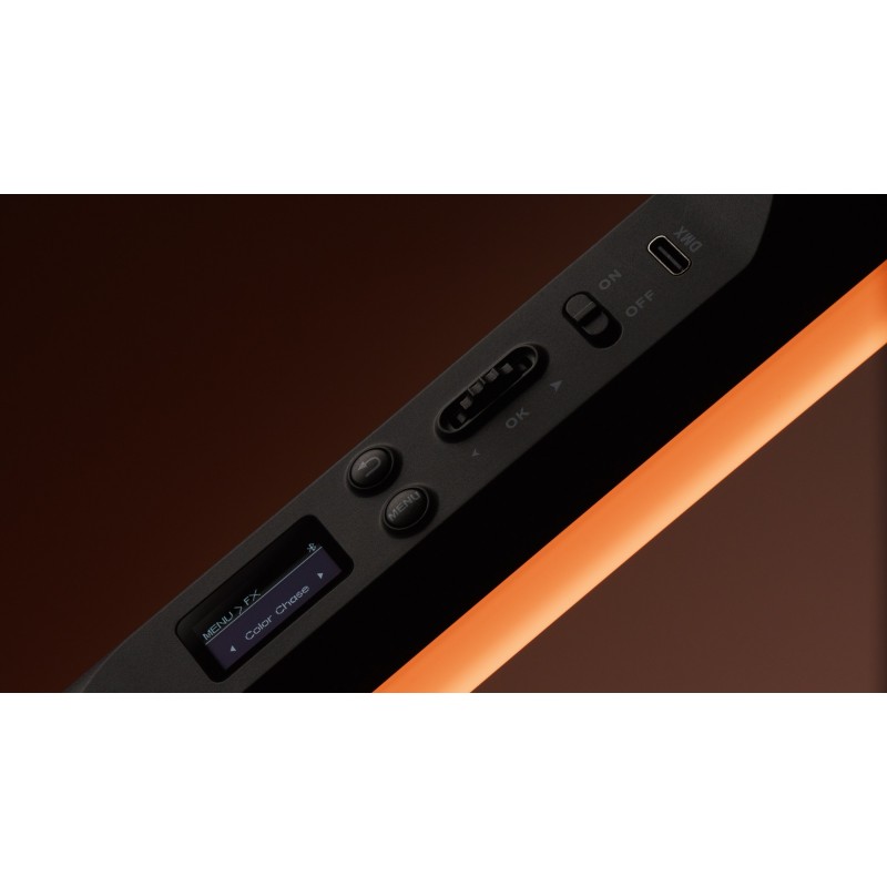 Obok włącznika lampy znajdziesz port USB-C, który umożliwi podłączenie urządzenia do systemu sterowania DMX512 za pomocą odpowiedniej przejściówki. Jeśli korzystasz z konsoli sterującej, służącej do zarządzania oświetleniem i efektami scenicznymi, lampa LED Amaran T4c będzie znakomitym uzupełnieniem takiego zestawu.
