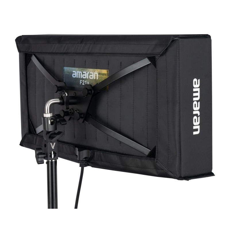W zestawie z lampą LED Amaran F21x - V-mount znajdziesz modyfikatory pozwalające zmiękczyć światło, rozproszyć ostre cienie i w razie potrzeby odpowiednio ukierunkować wiązkę. Możesz skorzystać z jednej lub dwóch tkanin dyfuzyjnych (-0,5 EV oraz -2,5 EV) lub sięgnąć po "plaster miodu" (grid 45°). Dzięki rzepom Velcro każdy z modyfikatorów w wygodny sposób zainstalujesz wewnątrz softboxa.