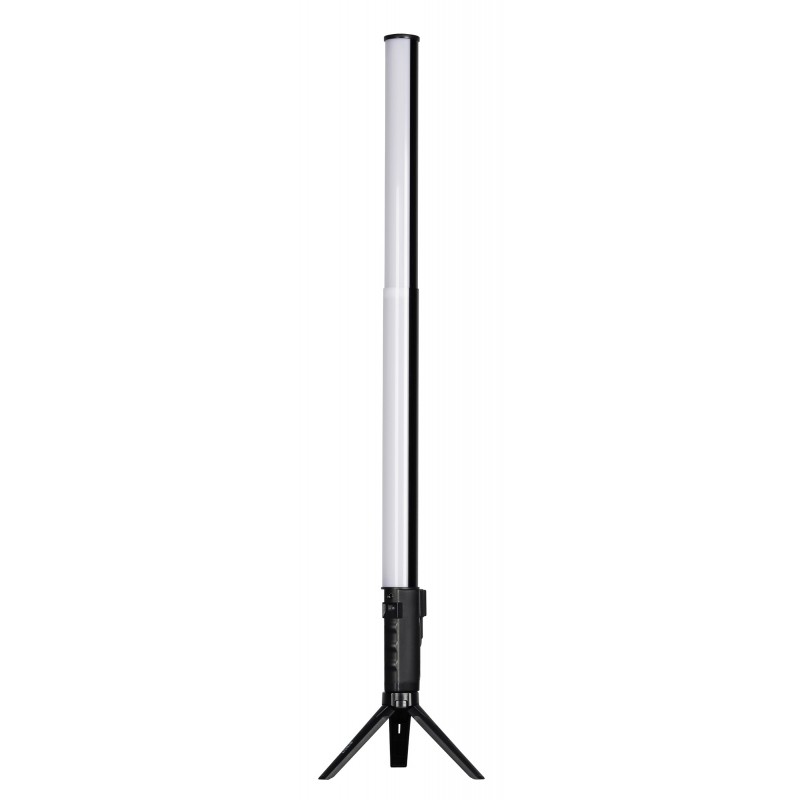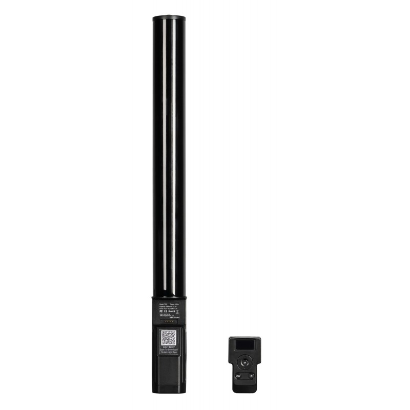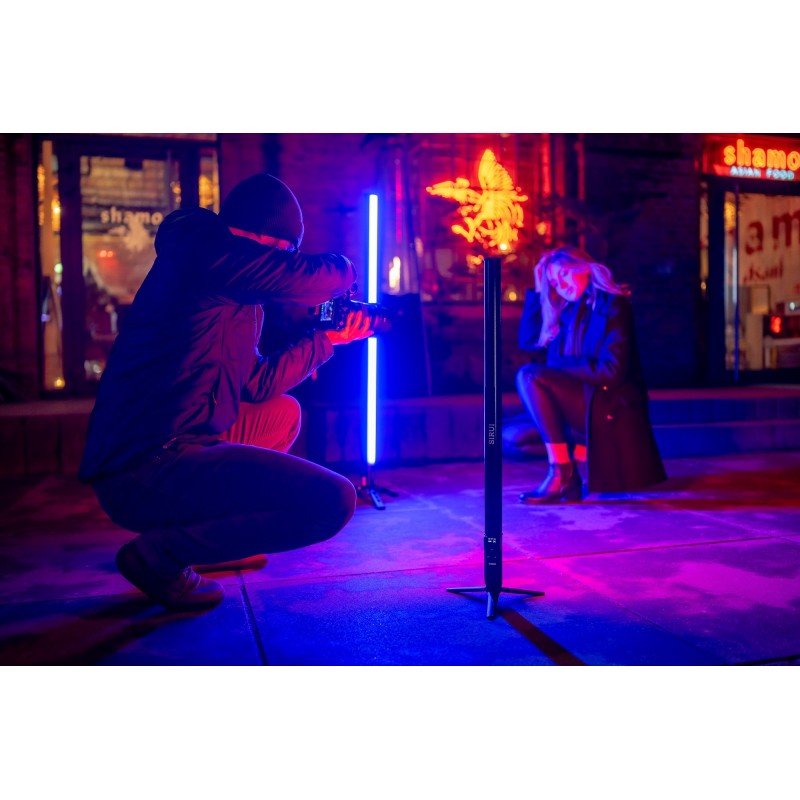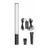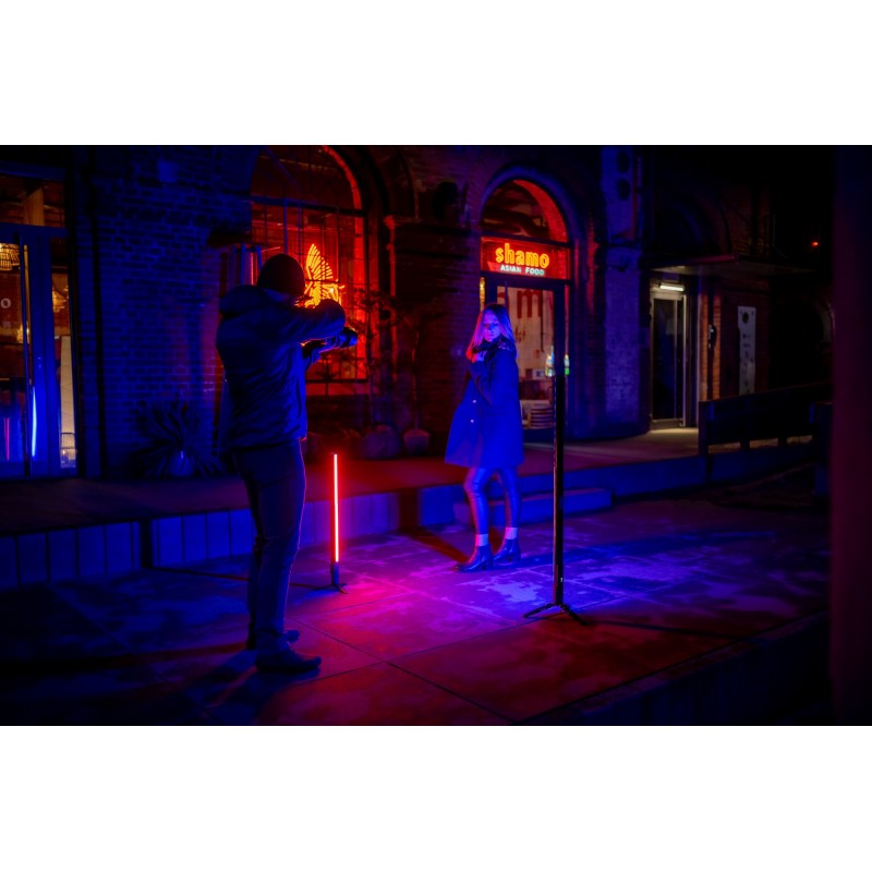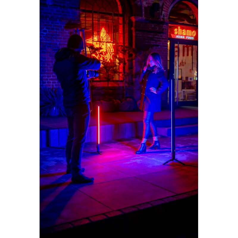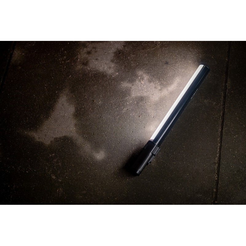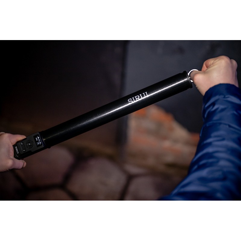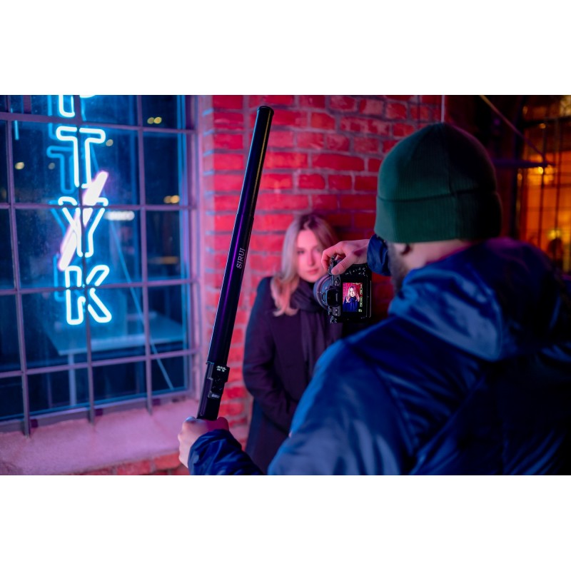Lampa LED Sirui T60 - RGB, WB (2500 K - 8000 K) to miecz świetlny o unikalnej teleskopowej budowie. Jeden prosty ruch wystarczy, aby wydłużyć ją z 45,5 cm do 74 cm. To doskonały wybór dla kreatywnych fotografów i filmowców, którzy chcą tworzyć unikalną atmosferę za pomocą światła, eksperymentować z efektami specjalnymi lub "malować" techniką "light painting". Lampa oferuje regulację temperatury barwowej, możliwość zmiany koloru światła w obrębie obszernej przestrzeni barw HSI, a także 14 gotowych efektów specjalnych. Urządzenie wyposażono w odczepiany panel kontrolny, który może pełnić funkcję pilota zdalnego sterowania. Miecz jest również kompatybilny z dedykowaną aplikacją mobilną. Lampę może zasilać wbudowany akumulator lub dołączony do zestawu zasilacz.