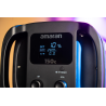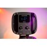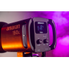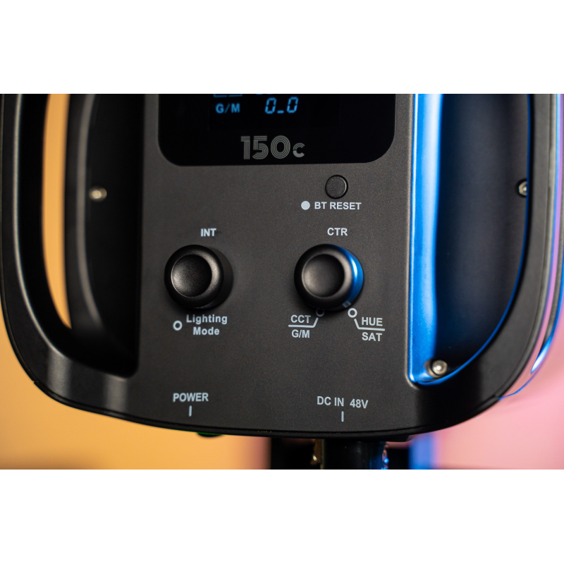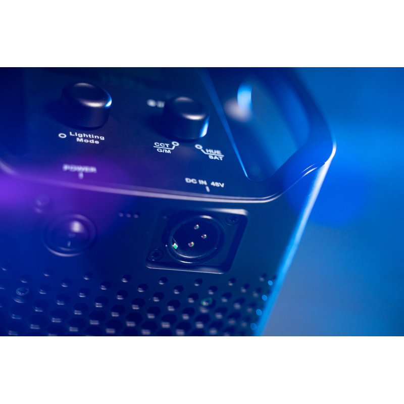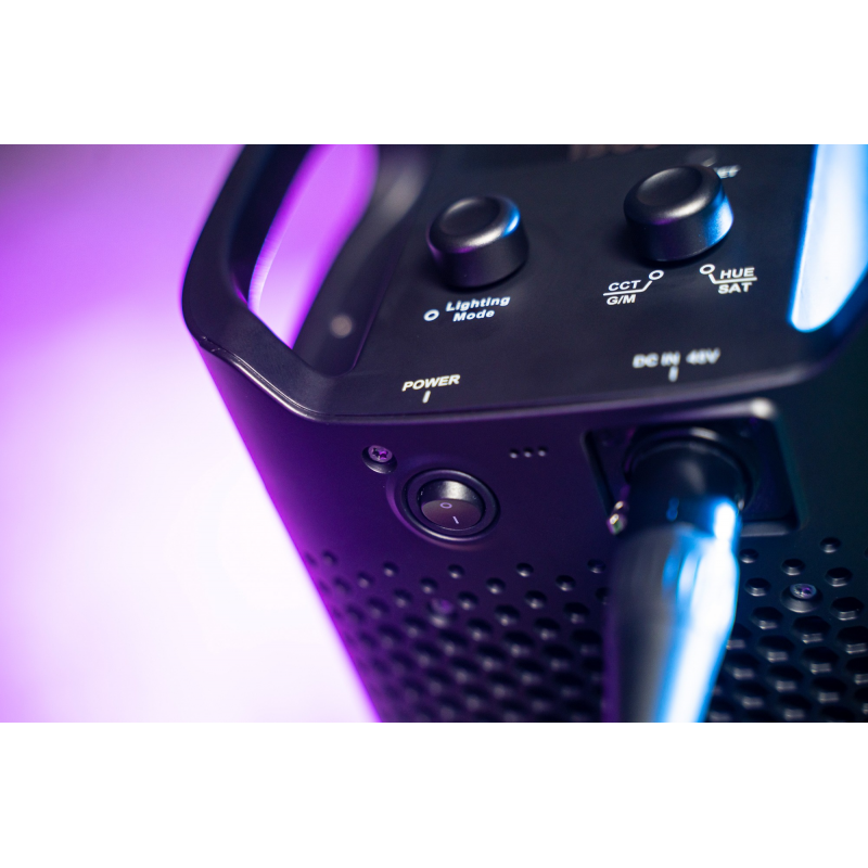 W tylnej części lampy umieszczono ekran LCD oraz 2 ergonomiczne pokrętła. Wystarczy jeden ruch ręki, aby płynnie dostosować temperaturę barwową lub ustawić wybrany kolor światła w obrębie palety HSI. Wszystkie niezbędne informacje znajdziesz na podświetlanym ekranie. Możesz wygodnie zmieniać barwę (hue), nasycenie (saturation) oraz jasność (intensity) światła. Producent nie zapomniał też o korekcji G/M (Green / Magenta).