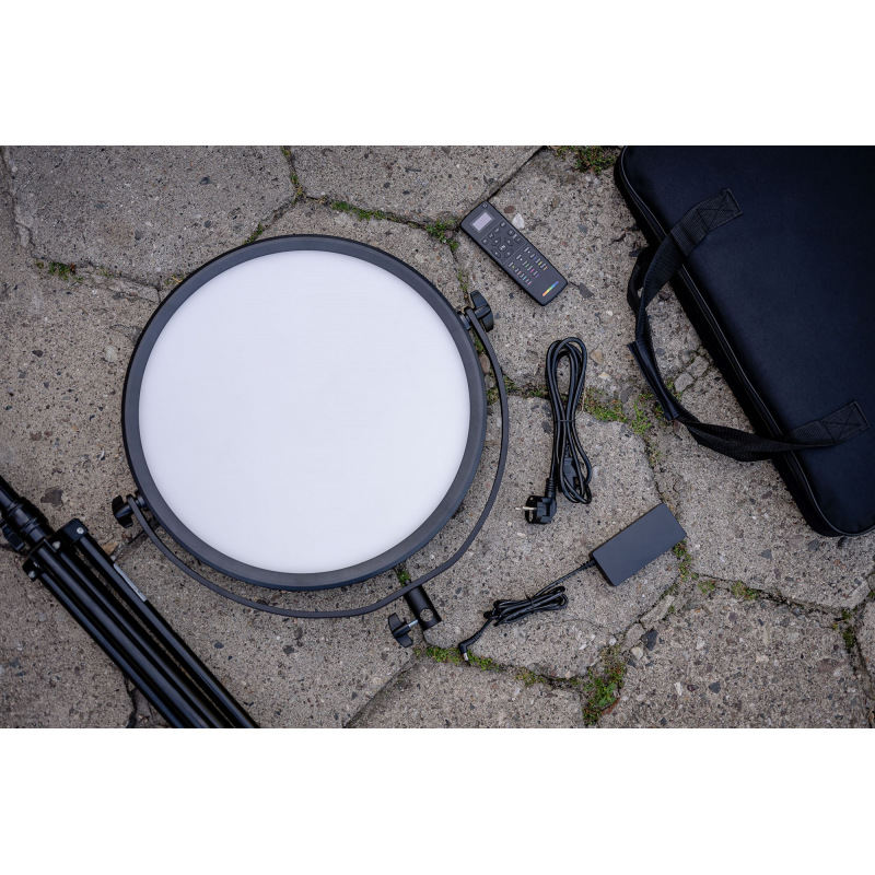 Lampa LED Newell Air Artha XL RGB RC APP została wyposażona w dyfuzor wykonany z lekkiego tworzywa o optymalnym prześwicie i mlecznej barwie. Umożliwia on uzyskanie równomiernego i naturalnego oświetlenia. Pozwala również skutecznie zredukować niepożądane cienie. Dzięki zastosowaniu dyfuzora nie musisz już sięgać po dodatkowy modyfikator światła, aby zapewnić sobie przyjemne i miękkie światło.