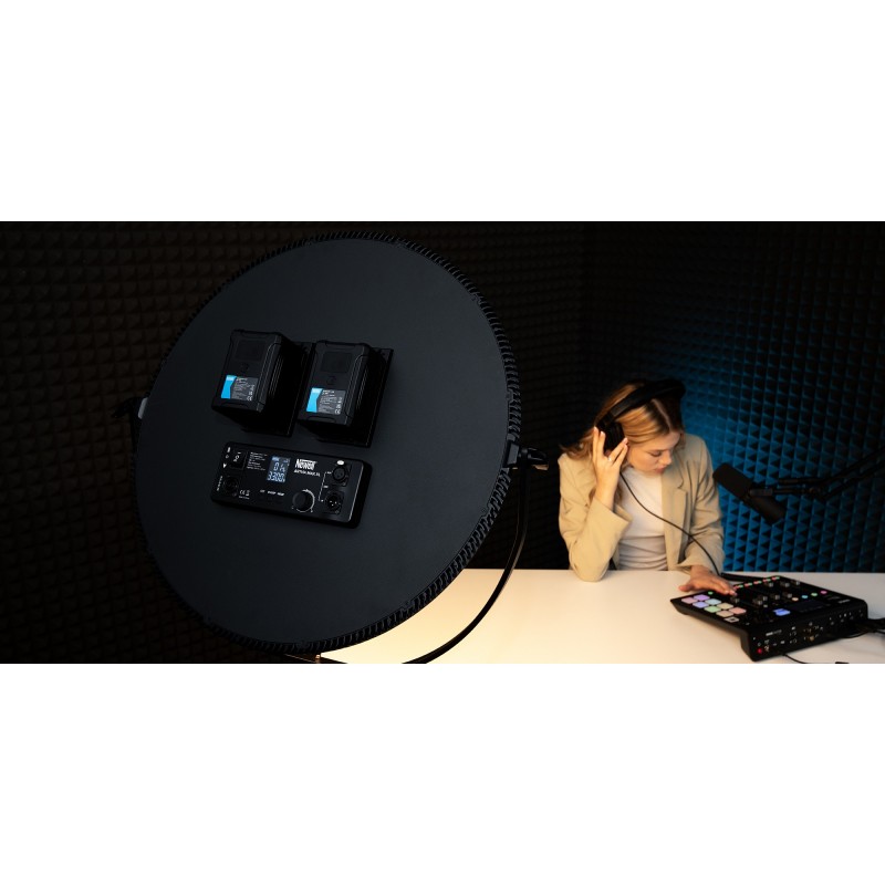 Zestaw, w którego skład wchodzi lampa Newell Air Artha Max XL oraz akumulator Newell BP-150 LCD V-Mount to wszystko, czego potrzebujesz, aby w wygodny sposób pracować z oświetleniem i uniezależnić się od gniazdek elektrycznych. Okrągły panel LED o średnicy 55,8 cm, z maks. mocą 110 W i strumieniem świetlnym 7000 lm oferuje regulację temperatury barwowej (2500 do 8500 K). Lampa została wyposażona w 2 gniazda V-Lock i bez problemu z jednym akumulatorem. Ogniwo może też pełnić funkcję power banku. Na jego obudowie znajdziesz również porty D-Tap, USB-C i USB-A, które rozszerzają wszechstronność jego zastosowań. Cały zestaw zapewni Ci mobilność, niezależność energetyczną i profesjonalną jakość oświetlenia zarówno w studio, jak i w terenie.