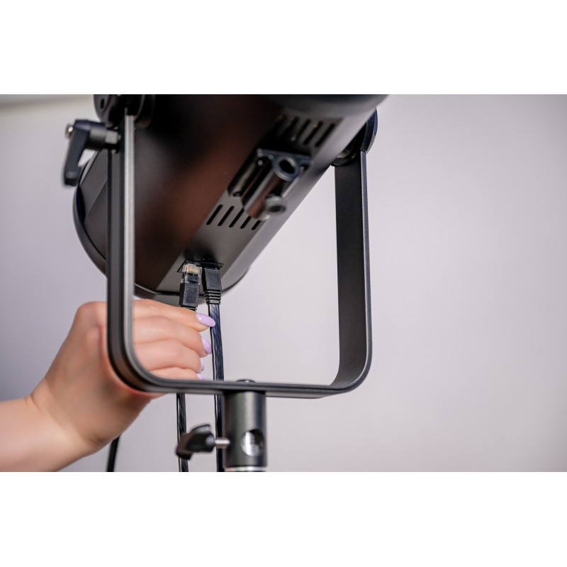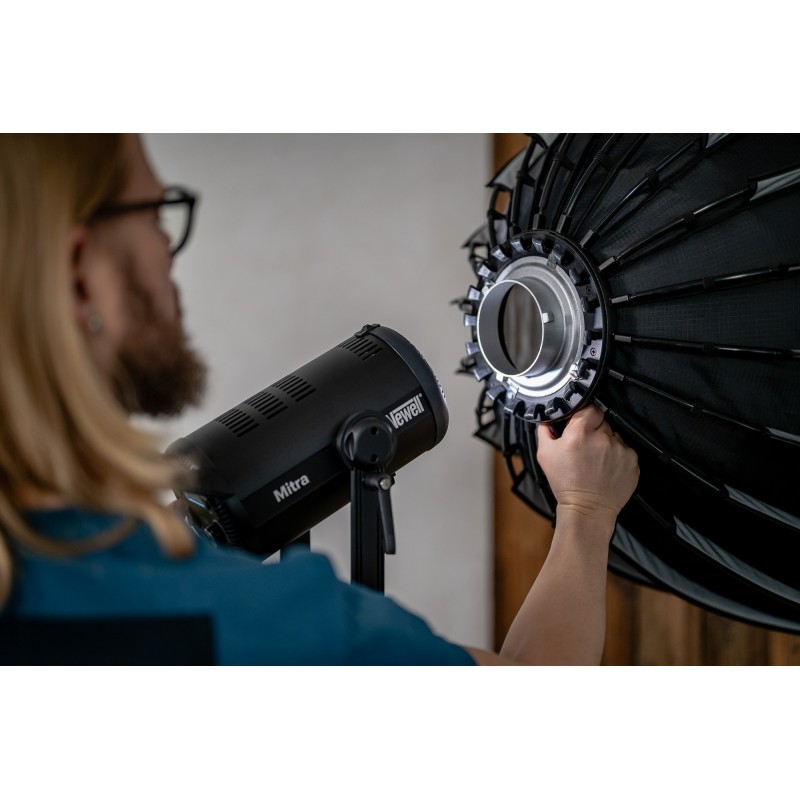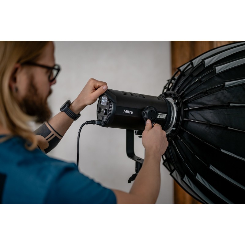 Lampę Newell RGB Mitra wyposażono w popularne mocowanie Bowens. Zapewnia ono szeroką kompatybilność z różnymi typami modyfikatorów stosowanych w filmie i fotografii. Dzięki mocowaniu połączysz lampę z dołączoną do zestawu czaszą lub z innymi akcesoriami, takimi jak wrota, softboxy lub strumienice.