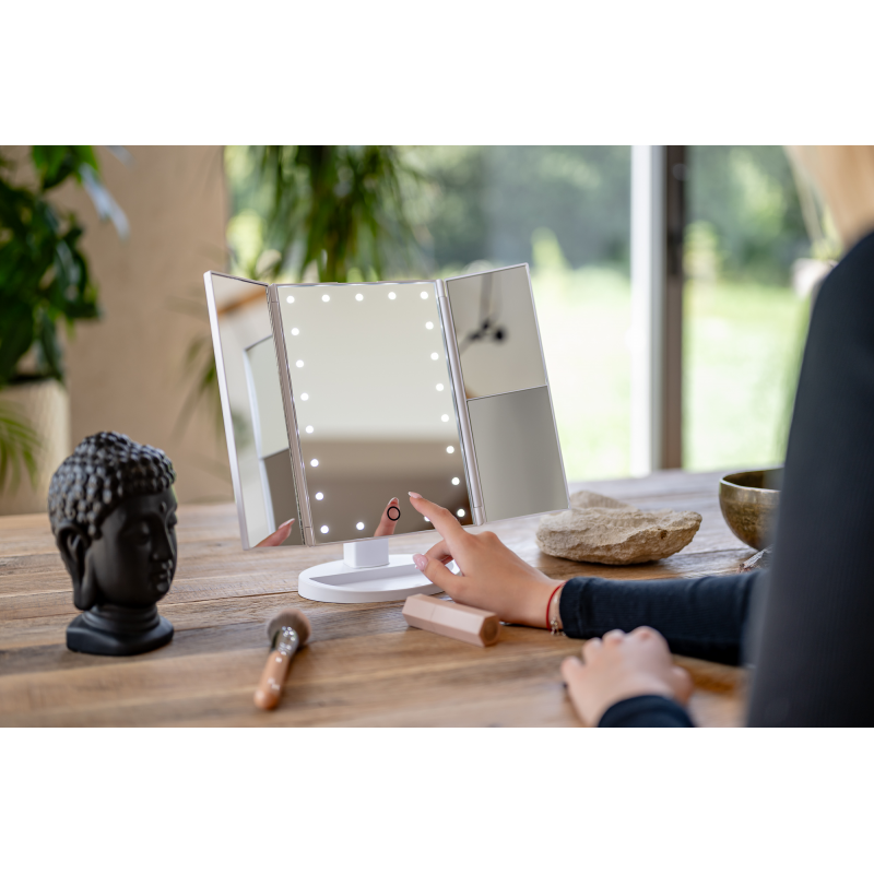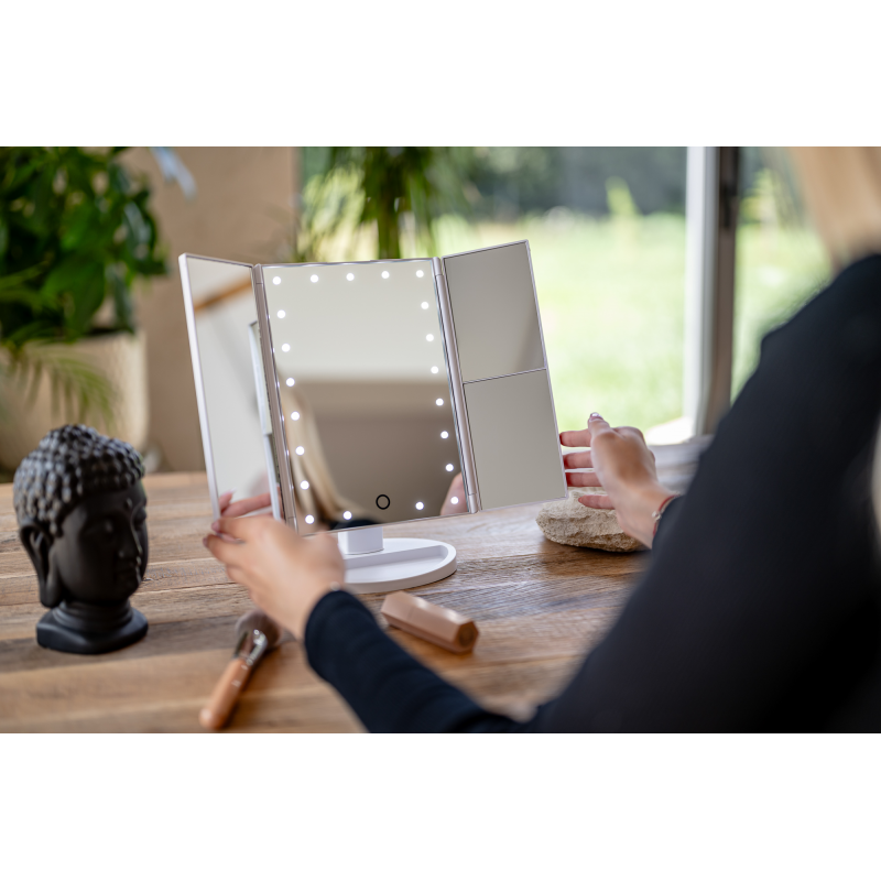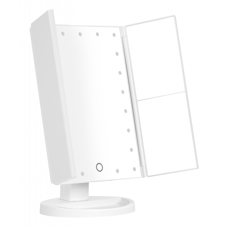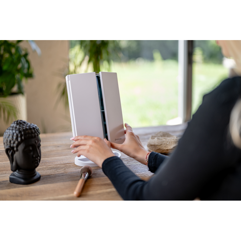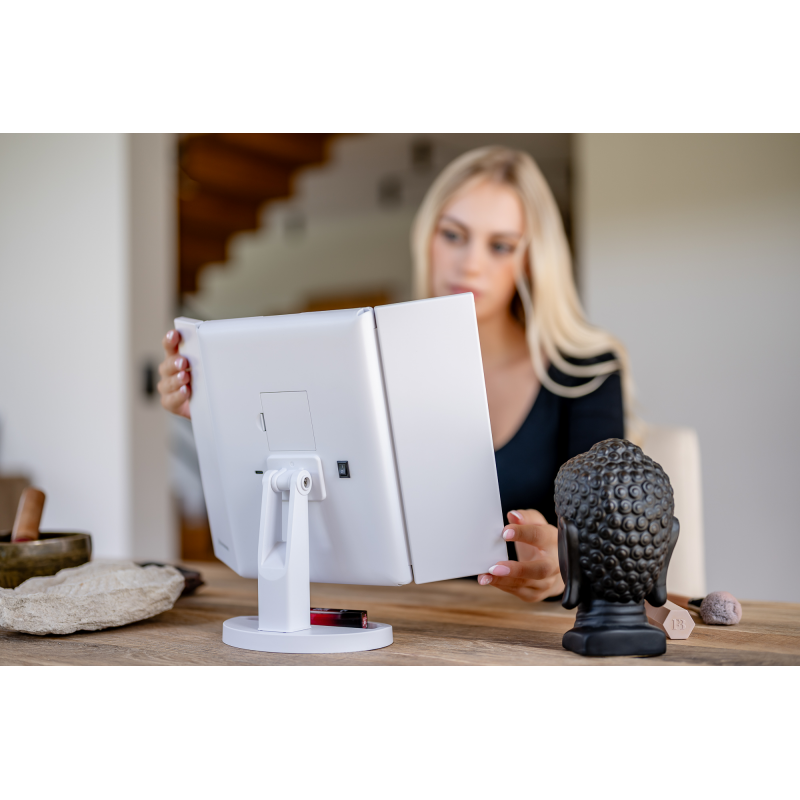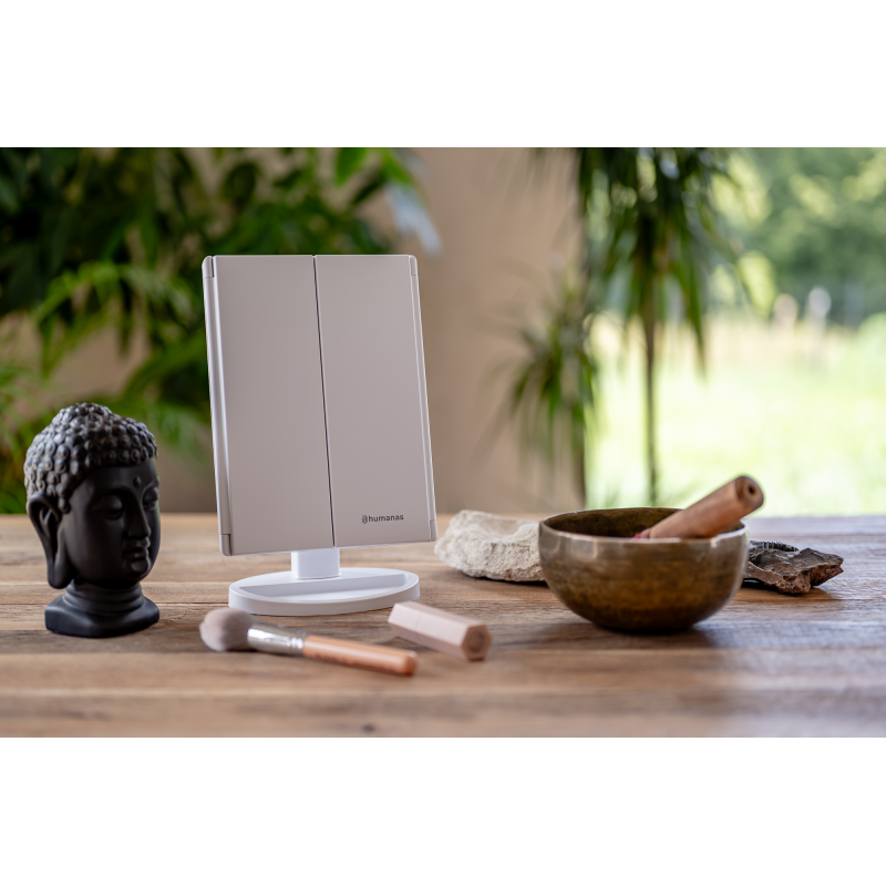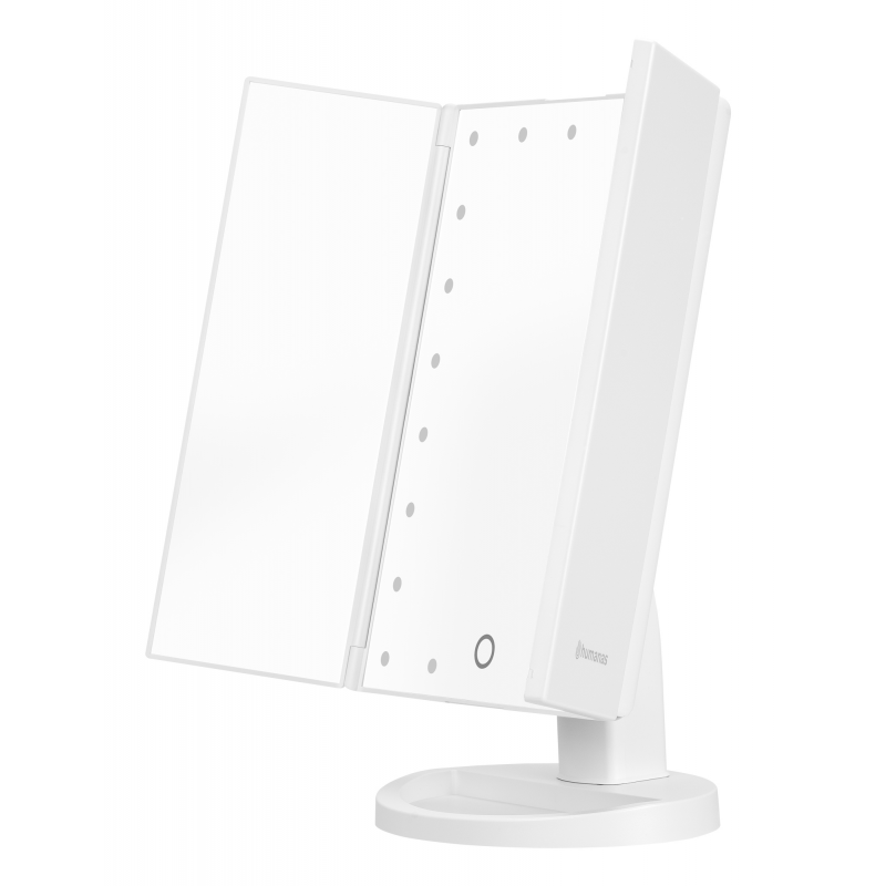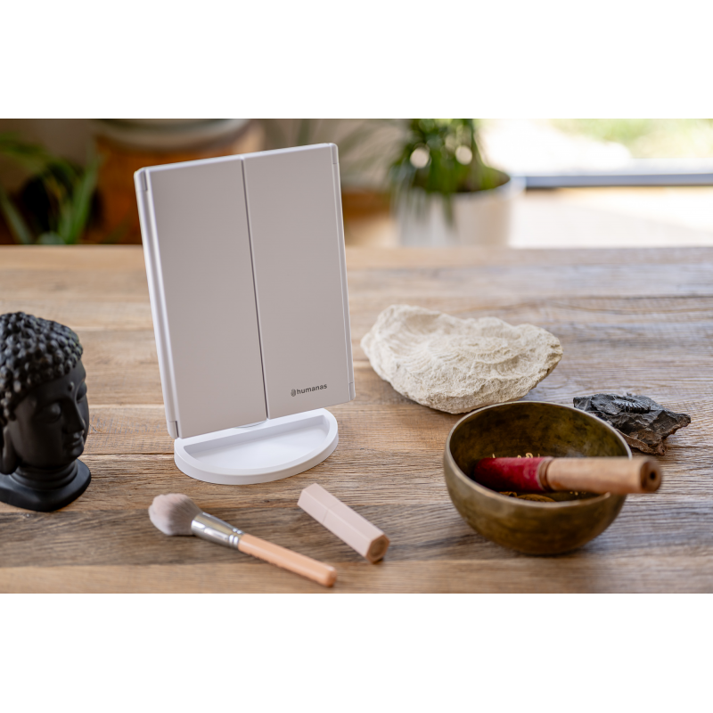 Lusterko do makijażu Humanas HS-ML04 to perfekcyjne połączenie stylu i funkcjonalności. Zapewnia doskonałe oświetlenie twarzy i sprawia, że codzienna pielęgnacja staje się prawdziwą przyjemnością. Dotykowy przycisk wkomponowany w taflę lustra pozwoli Ci z łatwością dostosować jasność światła do bieżących potrzeb. Urządzenie może być zasilane za pomocą baterii AAA lub dołączonego do zestawu kabla USB podłączonego do power banku, komputera lub ładowarki. Szybkie i wygodne rozkładanie pozwala zaoszczędzić miejsce na biurku lub toaletce. Moduły odchylane w zakresie 180º zapewnią Ci jeszcze większą swobodę podczas aplikacji makijażu. Dzięki dodatkowym lusterkom powiększającym zyskasz pełną kontrolę nad każdym szczegółem swojego make-upu.