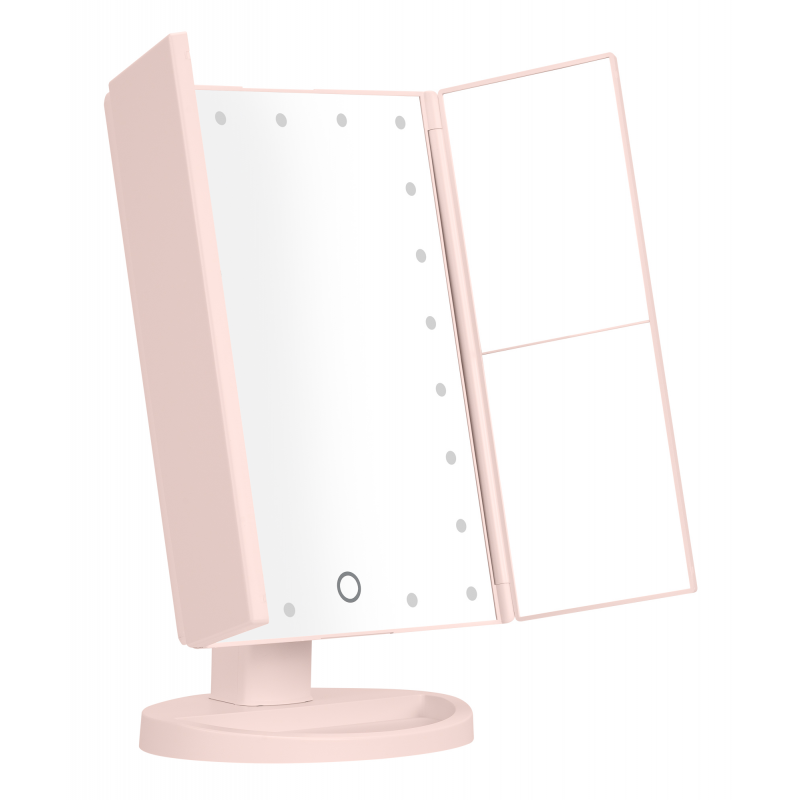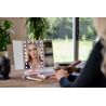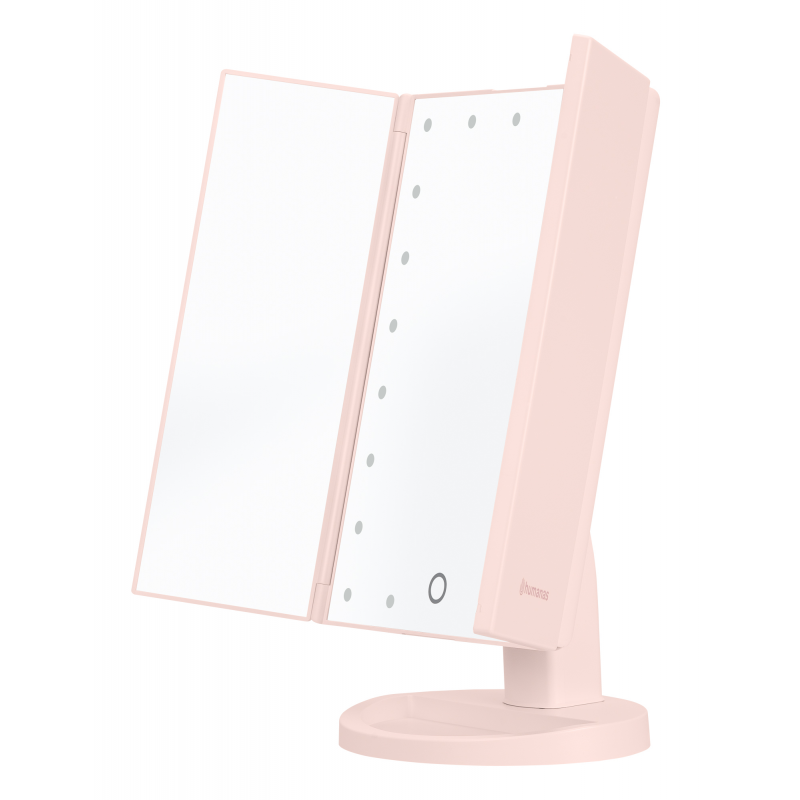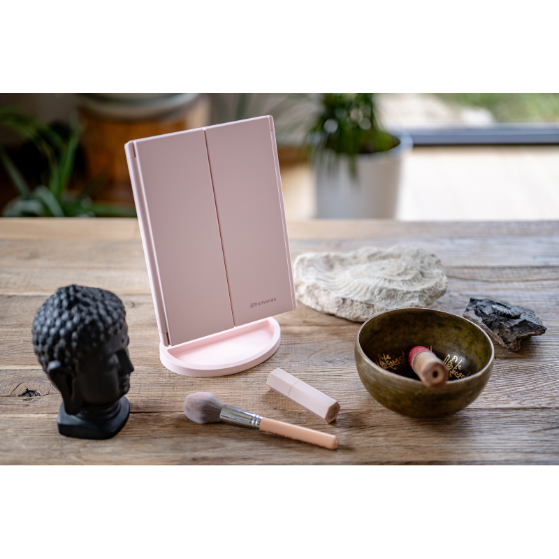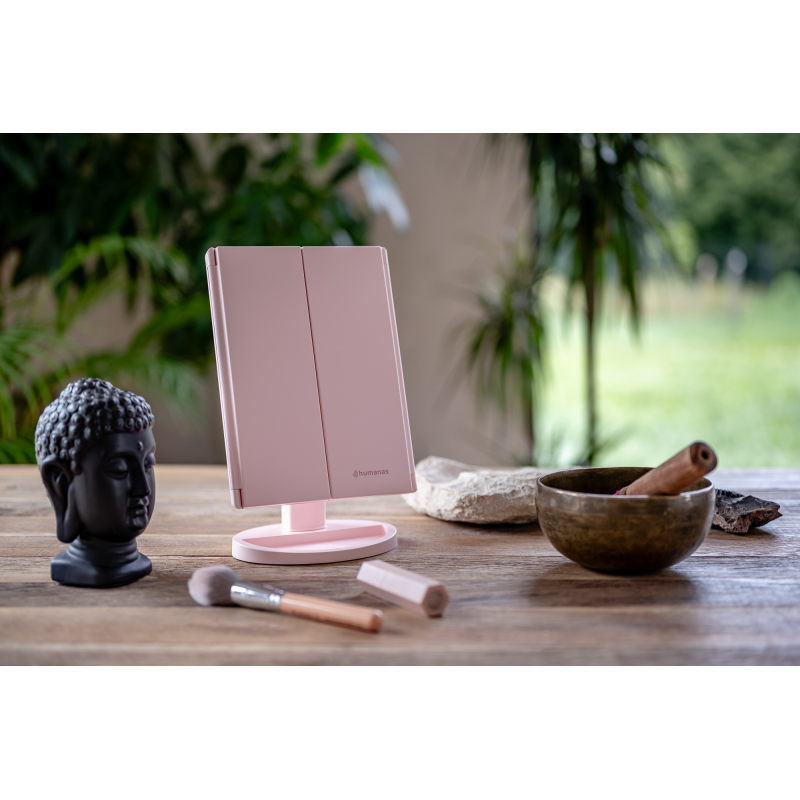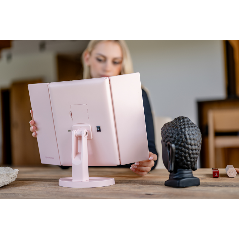 Lusterko do makijażu Humanas HS-ML04 to perfekcyjne połączenie stylu i funkcjonalności. Zapewnia doskonałe oświetlenie twarzy i sprawia, że codzienna pielęgnacja staje się prawdziwą przyjemnością. Dotykowy przycisk wkomponowany w taflę lustra pozwoli Ci z łatwością dostosować jasność światła do bieżących potrzeb. Urządzenie może być zasilane za pomocą baterii AAA lub dołączonego do zestawu kabla USB podłączonego do power banku, komputera lub ładowarki. Szybkie i wygodne rozkładanie pozwala zaoszczędzić miejsce na biurku lub toaletce. Moduły odchylane w zakresie 180º zapewnią Ci jeszcze większą swobodę podczas aplikacji makijażu. Dzięki dodatkowym lusterkom powiększającym zyskasz pełną kontrolę nad każdym szczegółem swojego make-upu.