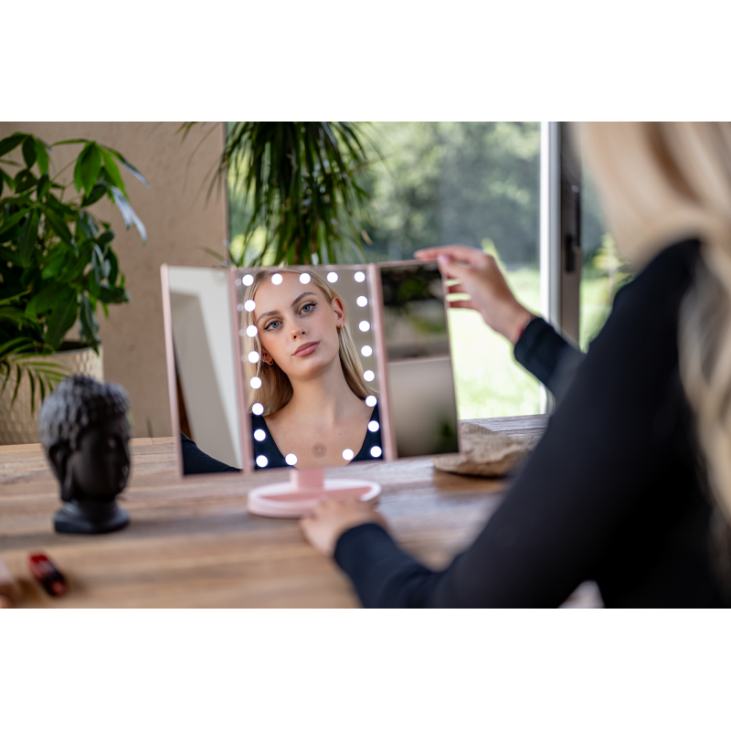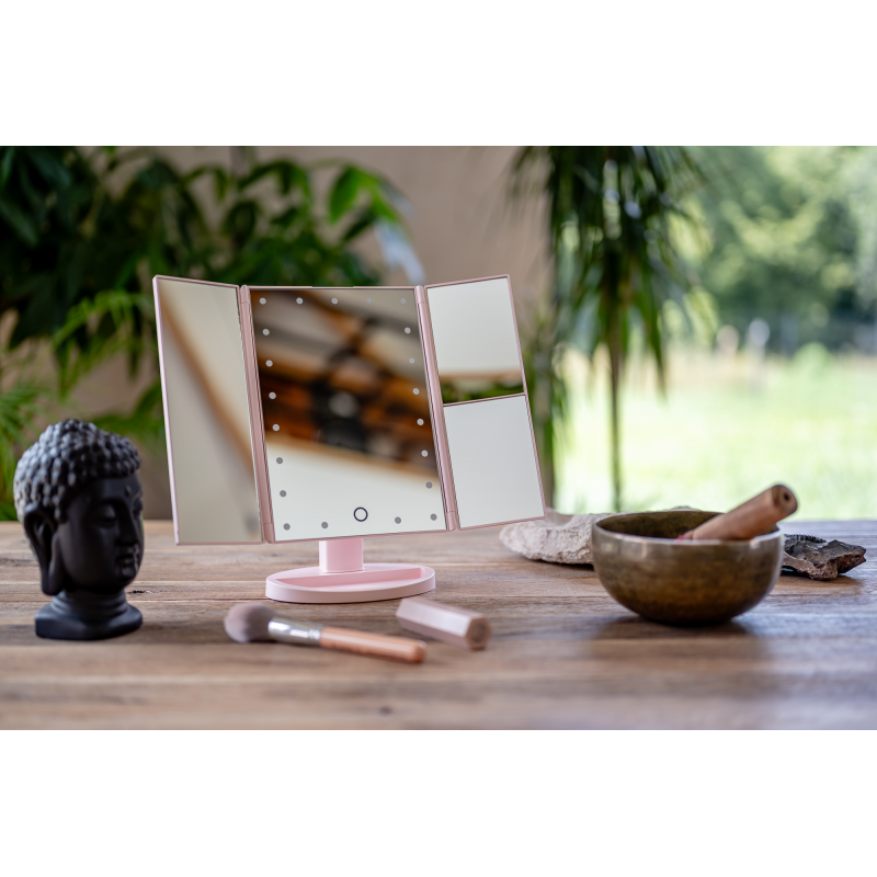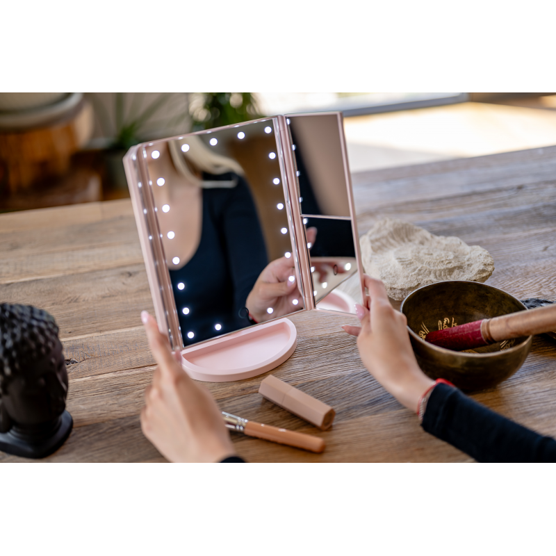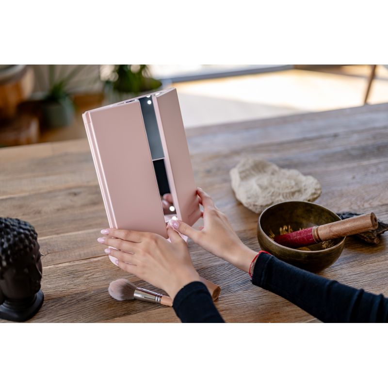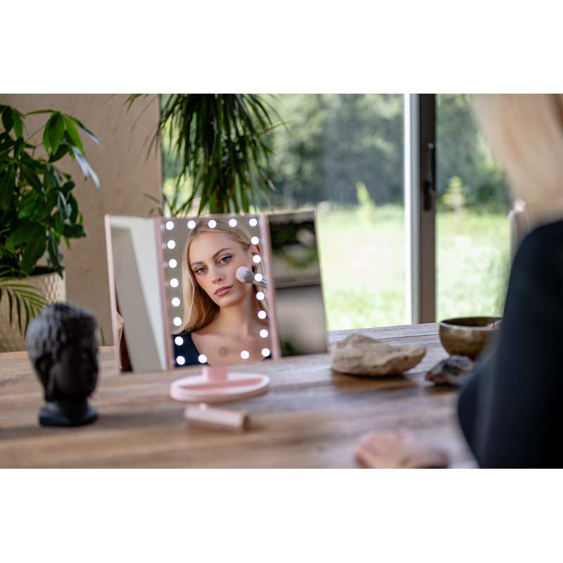Lusterko do makijażu Humanas HS-ML04 to perfekcyjne połączenie stylu i funkcjonalności. Zapewnia doskonałe oświetlenie twarzy i sprawia, że codzienna pielęgnacja staje się prawdziwą przyjemnością. Dotykowy przycisk wkomponowany w taflę lustra pozwoli Ci z łatwością dostosować jasność światła do bieżących potrzeb. Urządzenie może być zasilane za pomocą baterii AAA lub dołączonego do zestawu kabla USB podłączonego do power banku, komputera lub ładowarki. Szybkie i wygodne rozkładanie pozwala zaoszczędzić miejsce na biurku lub toaletce. Moduły odchylane w zakresie 180º zapewnią Ci jeszcze większą swobodę podczas aplikacji makijażu. Dzięki dodatkowym lusterkom powiększającym zyskasz pełną kontrolę nad każdym szczegółem swojego make-upu.