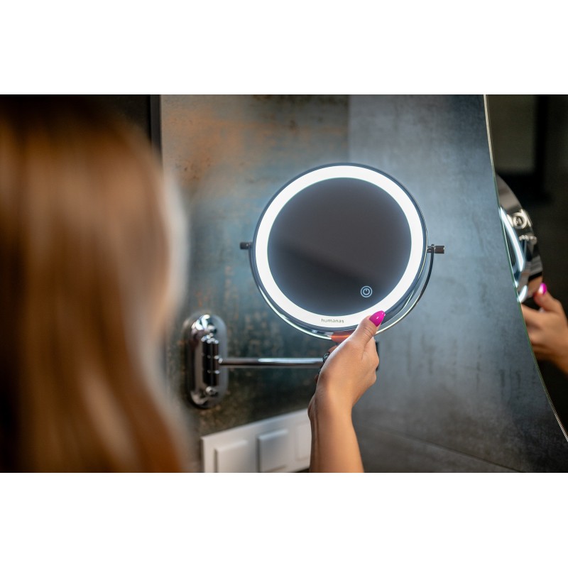 Lustro Humanas HS-BM01 to idealny wybór do każdej łazienki. Jego obie tafle o średnicy 20 cm zapewniają jasne podświetlenie LED, z regulacją mocy i 3 wariantami temperatury barwowej. Jedno z dostępnych luster oferuje również 5-krotne powiększenie. Wybierając ten model, nie musisz martwić się o dostęp do gniazdka elektrycznego. Srebrne lustro Humanas HS-BM01 wyposażono w akumulator o pojemności 2000 mAh. Wystarczy, że co jakiś czas podłączysz je do ładowarki lub power banku za pomocą dołączonego do zestawu kabla USB. Lustro może przylegać do ściany lub zostać rozłożone na odległość do 29 cm. Wszystko dzięki zastosowaniu przegubowego uchwytu, który z łatwością zainstalujesz na ścianie. Potrzebujesz zaledwie kilku minut, aby lustro Humanas HS-BM01 stało się ozdobą Twojej łazienki!