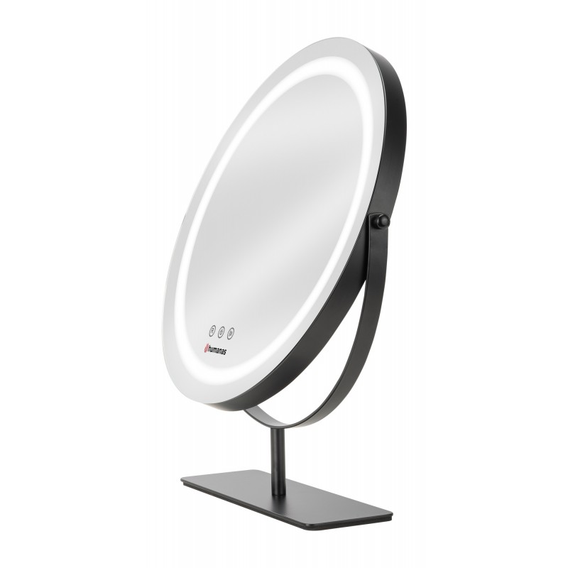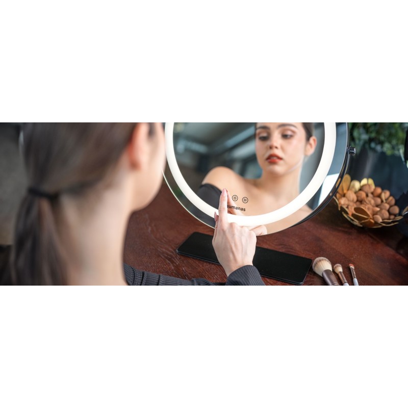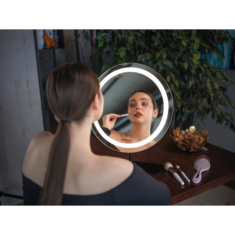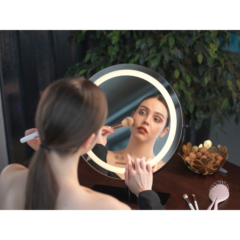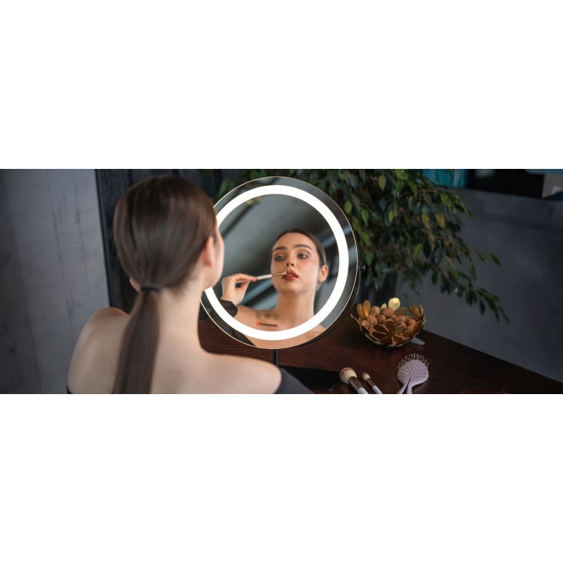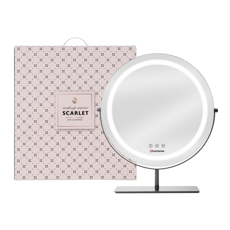 Lustro Humanas HS-HM Scarlet pomoże Ci wykonać perfekcyjny makijaż w niemal każdych warunkach. Panel LED okalający taflę szkła zapewni równomierne oświetlenie twarzy, ułatwiając precyzyjne nakładanie kosmetyków. Krzywe kreski, nierównomiernie rozprowadzony puder czy niedoskonale poprowadzony kontur oczu i ust przestaną być problemem. Możliwość regulacji położenia lustra w zakresie 360º to kolejny atut, który ułatwi wykonywanie makijażu. W zależności od potrzeb możesz ustawić pożądany poziom podświetlenia oraz wybrać jeden z 3 wariantów temperatury barwowej światła. Metalowe wykończenie w czarnym kolorze idealnie sprawdzi się zarówno w domu, jak i w studiu wizażu.